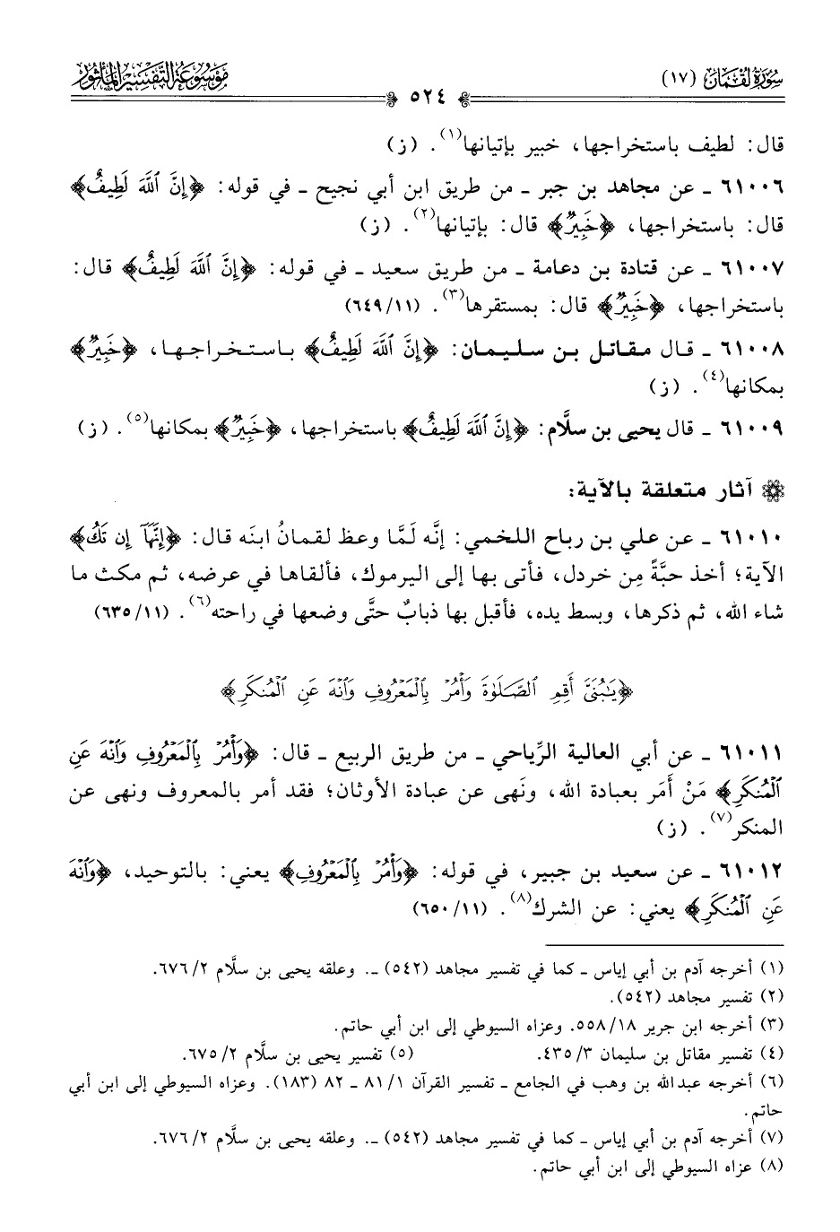 ٦١٠٠٦ - عن مجاهد بن جبر -من طريق ابن أبي نجيح- في قوله: {إنَّ اللَّهَ لَطِيفٌ} قال: باستخراجها، {خَبِير} قال: بإتيانها (¬٢). (ز)
