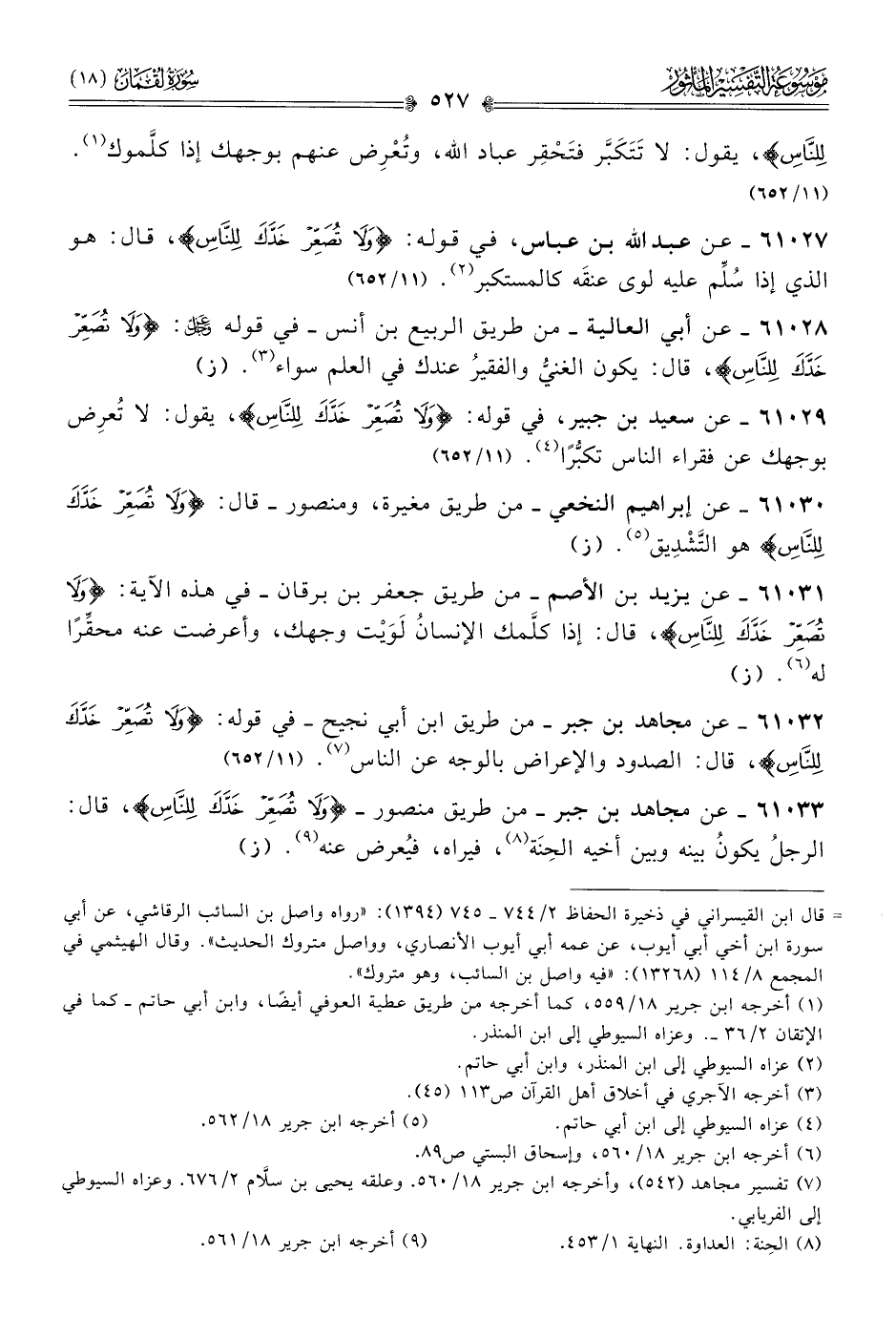 ٦١٠٣٣ - عن مجاهد بن جبر -من طريق منصور- {ولا تُصَعِّرْ خَدَّكَ لِلنّاسِ}، قال: الرجلُ يكونُ بينه وبين أخيه الحِنَة (¬٨)، فيراه، فيُعرض عنه (¬٩). (ز)