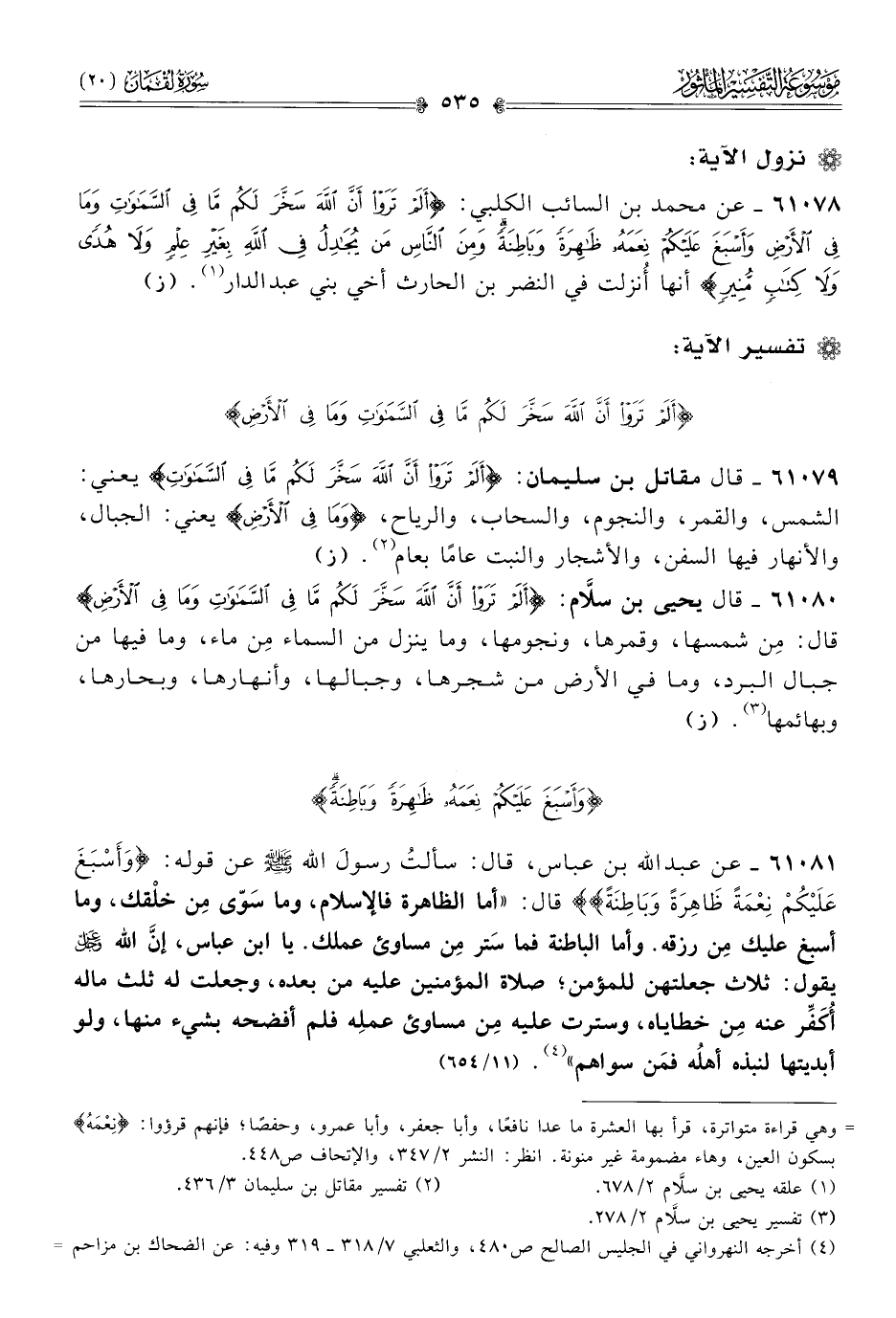 ٦١٠٧٨ - عن محمد بن السائب الكلبي: {ألَمْ تَرَوْا أنَّ اللَّهَ سَخَّرَ لَكُمْ ما فِي السّماواتِ وما فِي الأَرْضِ وأَسْبَغَ عَلَيْكُمْ نِعَمَهُ ظاهِرَةً وباطِنَةً ومِنَ النّاسِ مَن يُجادِلُ فِي اللَّهِ بِغَيْرِ عِلْمٍ ولا هُدًى ولا كِتابٍ مُنِيرٍ} أنها أُنزلت في النضر بن الحارث أخي بني عبد الدار (¬١). (ز)