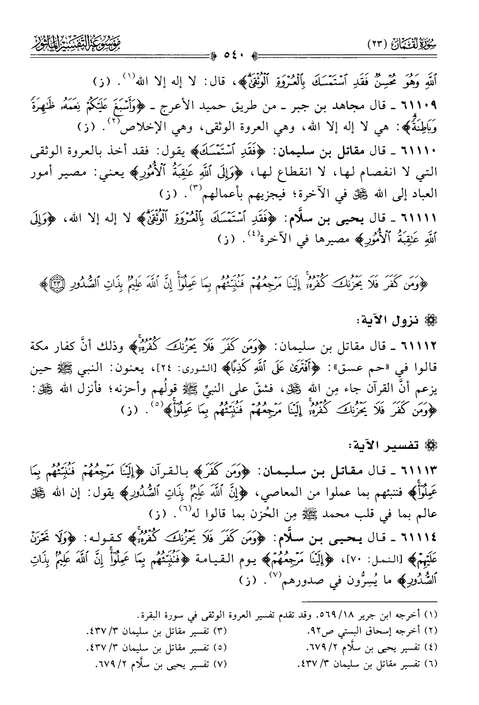 ٦١١١١ - قال يحيى بن سلّام: {فَقَدِ اسْتَمْسَكَ بِالعُرْوَةِ الوُثْقى} لا إله إلا الله، {وإلى اللَّهِ عاقِبَةُ الأُمُورِ} مصيرها في الآخرة (¬٤). (ز)