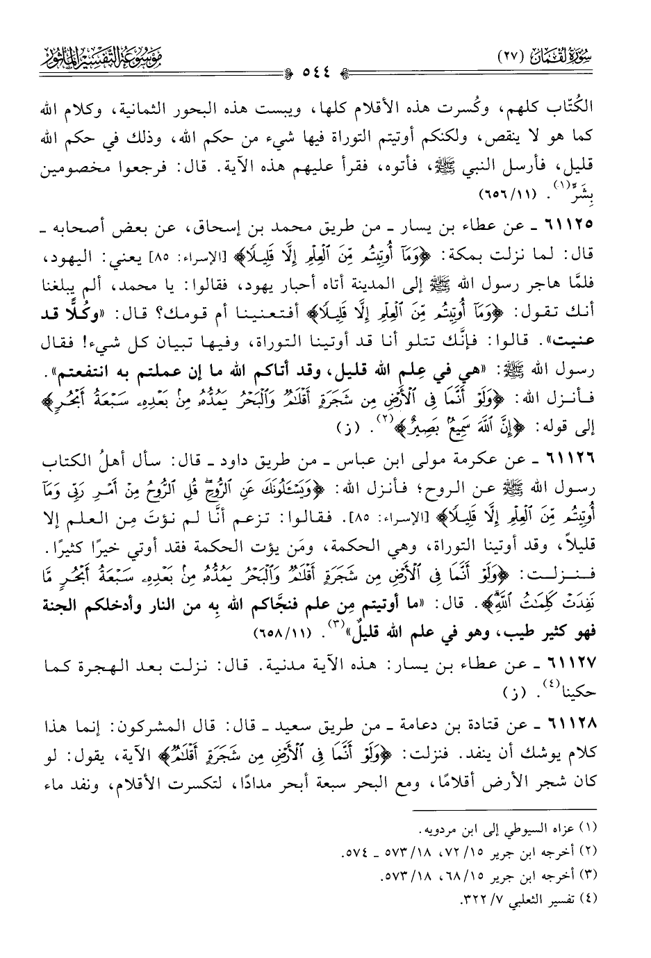 ٦١١٢٥ - عن عطاء بن يسار -من طريق محمد بن إسحاق، عن بعض أصحابه- قال: لما نزلت بمكة: {وما أُوتِيتُمْ مِنَ العِلْمِ إلّا قَلِيلًا} يعني: اليهود، فلمّا هاجر رسول الله - صلى الله عليه وسلم - إلى المدينة أتاه أحبار يهود، فقالوا: يا محمد، ألم يبلغنا أنك تقول: {وما أُوتِيتُمْ مِنَ العِلْمِ إلّا قَلِيلًا} أفتعنينا أم قومك؟ قال: «وكُلًّا قد عنيت». قالوا: فإنّك تتلو أنا قد أوتينا التوراة، وفيها تبيان كل شيء! فقال رسول الله - صلى الله عليه وسلم -: «هي في عِلم الله قليل، وقد أتاكم الله ما إن عملتم به انتفعتم». فأنزل الله: {ولو أنما في الأرض من شجرة أقلام والبحر يمده من بعده سبعة أبحر} إلى قوله: {إنَّ اللَّهَ سَمِيعٌ بَصِيرٌ} (¬٢). (ز)
