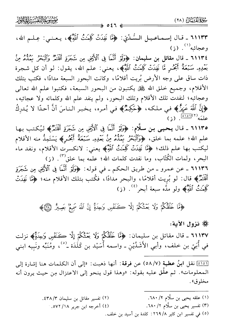 ٦١١٣٤ - قال مقاتل بن سليمان: {ولَوْ أنَّما فِي الأَرْضِ مِن شَجَرَةٍ أقْلامٌ والبَحْرُ يَمُدُّهُ مِن بَعْدِهِ سَبْعَةُ أبْحُرٍ ما نَفِدَتْ كَلِماتُ اللَّهِ}، يعني: علم الله، يقول: لو أن كل شجرة ذات ساق على وجه الأرض بُريت أقلامًا، وكانت البحور السبعة مدادًا، فكتب بتلك الأقلام، وجميع خلق الله - عز وجل - يكتبون من البحور السبعة، فكتبوا علم الله تعالى وعجائبه؛ لنفدت تلك الأقلام وتلك البحور، ولم ينفد علم الله وكلماته ولا عجائبه، {إنَّ اللَّهَ عَزِيزٌ} في ملكه، {حكِيمٌ} في أمره، يخبر الناسَ أنّ أحدًا لا يُدرِكُ علمَه (¬٢) [٥١٥١]. (ز)