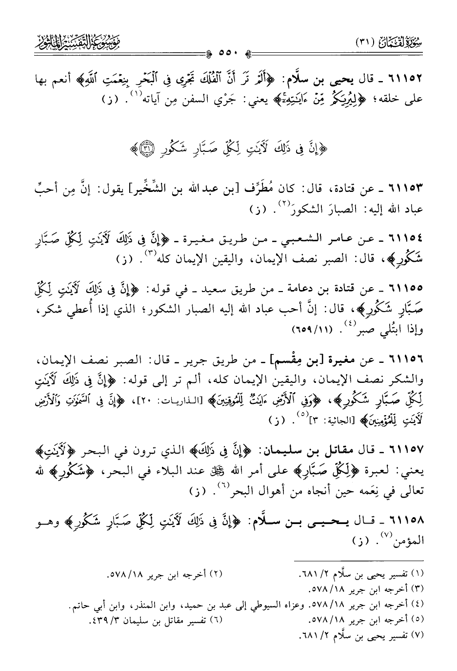 ٦١١٥٨ - قال يحيى بن سلّام: {إنَّ فِي ذَلِكَ لَآياتٍ لِكُلِّ صَبّارٍ شَكُورٍ} وهو المؤمن (¬٧). (ز)