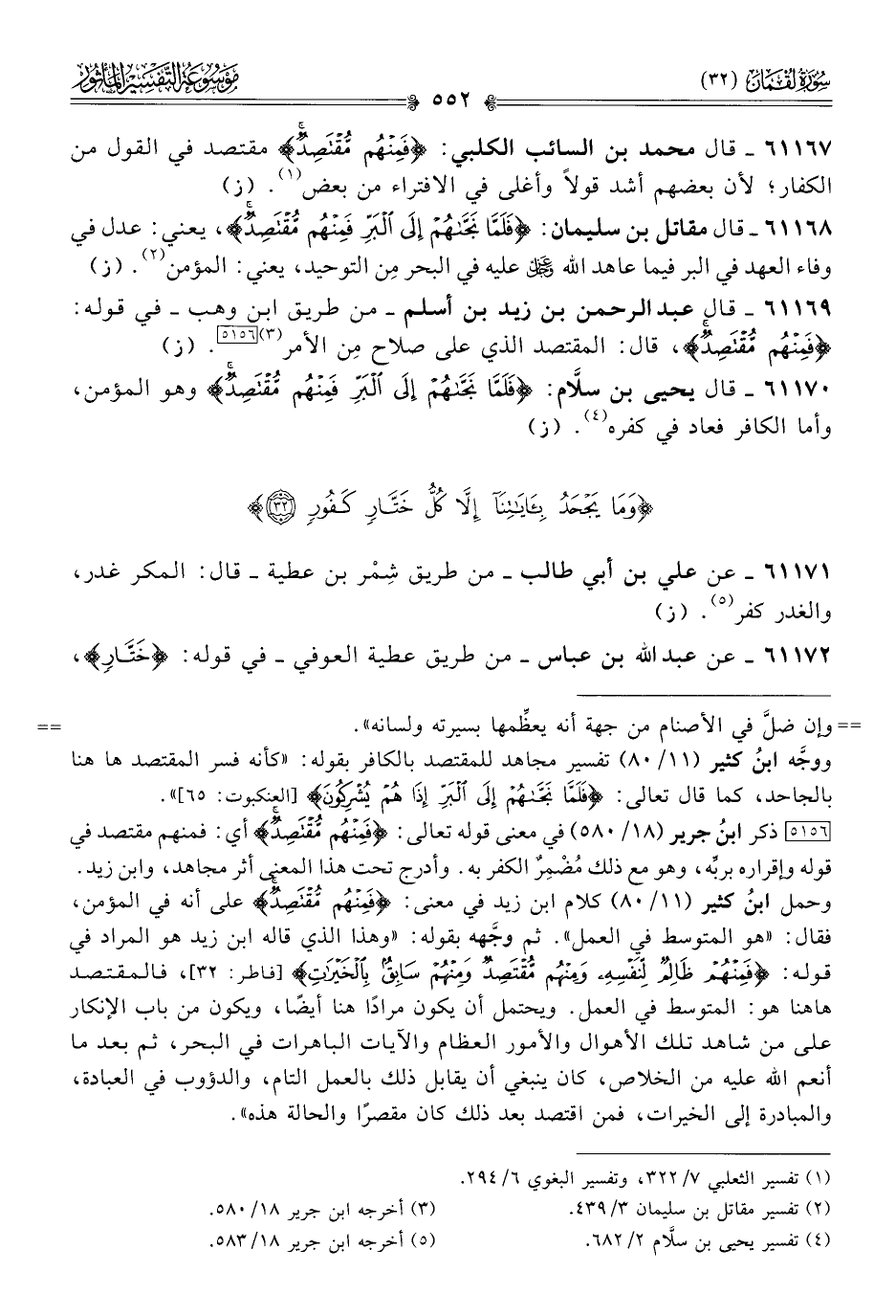 ٦١١٧٠ - قال يحيى بن سلّام: {فَلَمّا نَجّاهُمْ إلى البَرِّ فَمِنهُمْ مُقْتَصِدٌ} وهو المؤمن، وأما الكافر فعاد في كفره (¬٤). (ز)