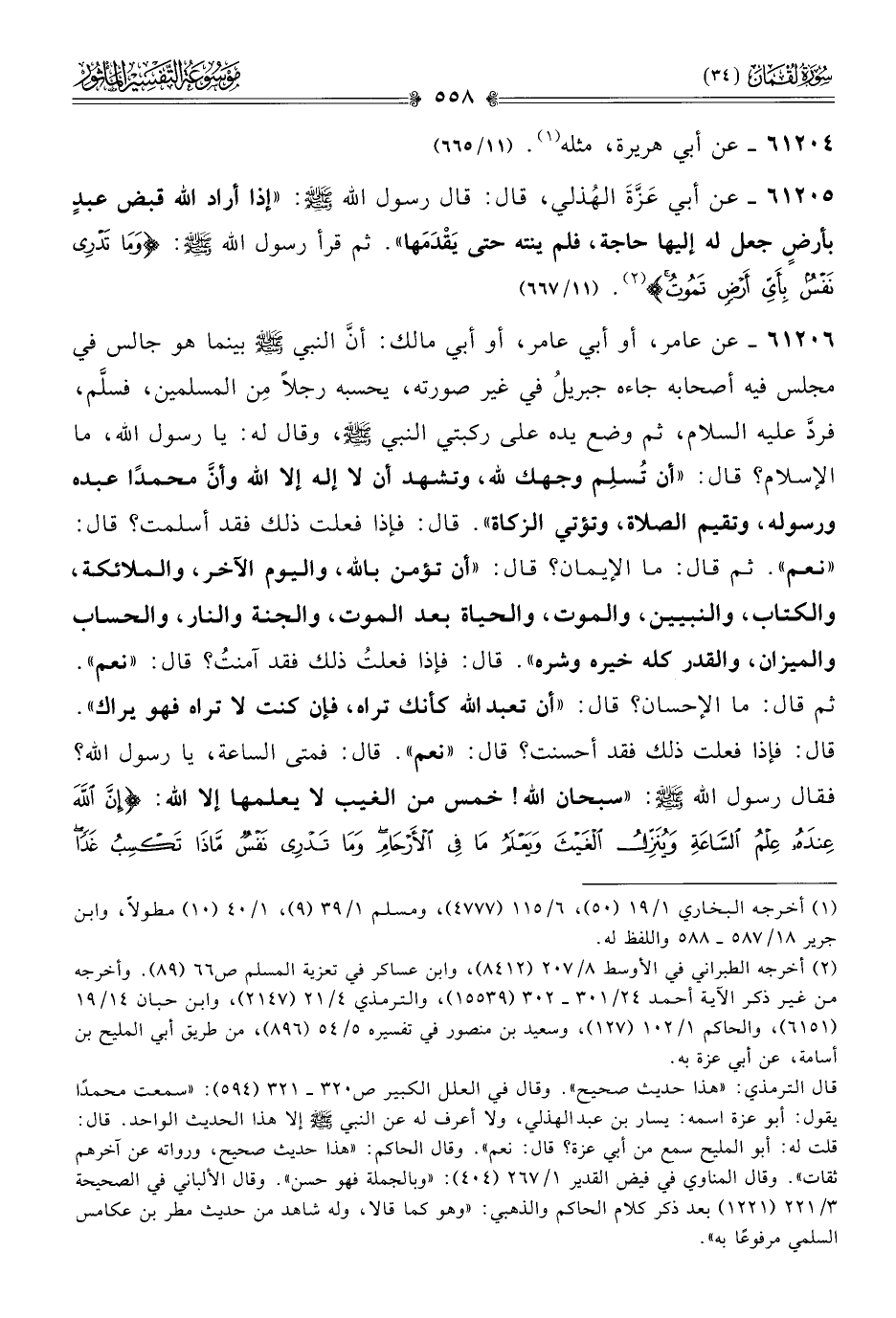 ٦١٢٠٦ - عن عامر، أو أبي عامر، أو أبي مالك: أنّ النبي - صلى الله عليه وسلم - بينما هو جالس في مجلس فيه أصحابه جاءه جبريلُ في غير صورته، يحسبه رجلًا مِن المسلمين، فسلَّم، فردَّ - عليه السلام -، ثم وضع يده على ركبتي النبي - صلى الله عليه وسلم -، وقال له: يا رسول الله، ما الإسلام؟ قال: «أن تُسلِم وجهك لله، وتشهد أن لا إله إلا الله وأنّ محمدًا عبده ورسوله، وتقيم الصلاة، وتؤتي الزكاة». قال: فإذا فعلت ذلك فقد أسلمت؟ قال: «نعم». ثم قال: ما الإيمان؟ قال: «أن تؤمن بالله، واليوم الآخر، والملائكة، والكتاب، والنبيين، والموت، والحياة بعد الموت، والجنة والنار، والحساب والميزان، والقدر كله خيره وشره». قال: فإذا فعلتُ ذلك فقد آمنتُ؟ قال: «نعم». ثم قال: ما الإحسان؟ قال: «أن تعبد الله كأنك تراه، فإن كنت لا تراه فهو يراك». قال: فإذا فعلت ذلك فقد أحسنت؟ قال: «نعم». قال: فمتى الساعة، يا رسول الله؟ فقال رسول الله - صلى الله عليه وسلم -: «سبحان الله! خمس من الغيب لا يعلمها إلا الله: {إنَّ اللَّهَ عِنْدَهُ عِلْمُ السّاعَةِ ويُنَزِّلُ الغَيْثَ ويَعْلَمُ ما فِي الأَرْحامِ وما تَدْرِي نَفْسٌ ماذا تَكْسِبُ غَدًا