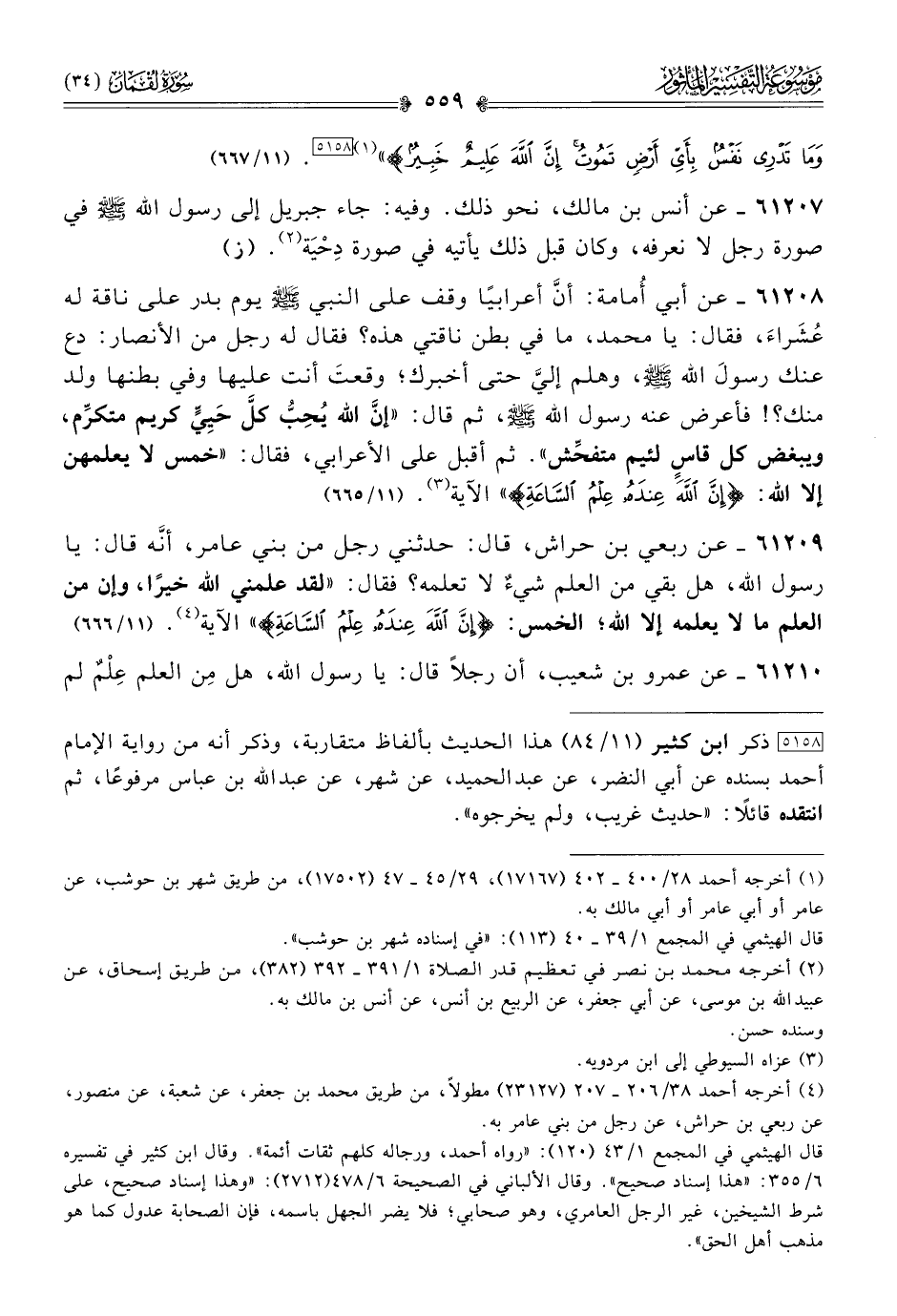 ٦١٢٠٩ - عن ربعي بن حراش، قال: حدثني رجل من بني عامر أنّه قال: يا رسول الله، هل بقي من العلم شيءٌ لا تعلمه؟ فقال: «لقد علمني الله خيرًا، وإن من العلم ما لا يعلمه إلا الله؛ الخمس: {إنَّ اللَّهَ عِنْدَهُ عِلْمُ السّاعَةِ}» الآية (¬٤). (١١/ ٦٦)
