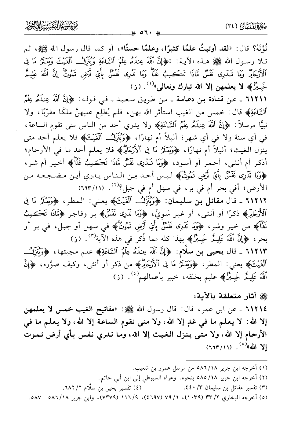٦١٢١١ - عن قتادة بن دعامة -من طريق سعيد- في قوله: {إنَّ اللَّهَ عِنْدَهُ عِلْمُ السّاعَةِ} قال: خمس من الغيب استأثر الله بهن، فلم يُطلِع عليهنَّ ملكا مقرّبًا، ولا نبيًّا مرسلًا: {إنَّ اللَّهَ عِنْدَهُ عِلْمُ السّاعَةِ} ولا يدري أحد من الناس متى تقوم الساعة، في أي سنة ولا في أي شهر؛ أليلًا أم نهارًا، {ويُنَزِّلُ الغَيْثَ} فلا يعلم أحد متى ينزل الغيث؛ أليلًا أم نهارًا، {ويَعْلَمُ ما فِي الأَرْحامِ} فلا يعلم أحد ما في الأرحام؛ أذكر أم أنثى، أحمر أو أسود، {وما تَدْرِي نَفْسٌ ماذا تَكْسِبُ غَدًا} أخير أم شر، {وما تَدْرِي نَفْسٌ بِأَيِّ أرْضٍ تَمُوتُ} ليس أحد مِن الناس يدري أين مضجعه من الأرض؛ أفي بحر أم في بر، في سهل أم في جبل؟ (¬٢). (١١/ ٦٦٣)