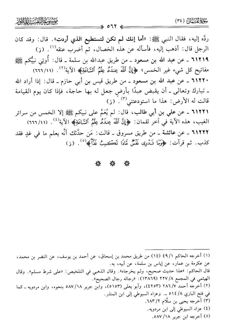 ٦١٢١٩ - عن عبدالله بن مسعود -من طريق عبد الله بن سلمة- قال: أُوتِي نبيُّكم - صلى الله عليه وسلم - مفاتيح كل شيء غير الخمس؛ {إنَّ اللَّهَ عِنْدَهُ عِلْمُ السّاعَةِ} الآية (¬٢). (١١/ ٦٦٦)