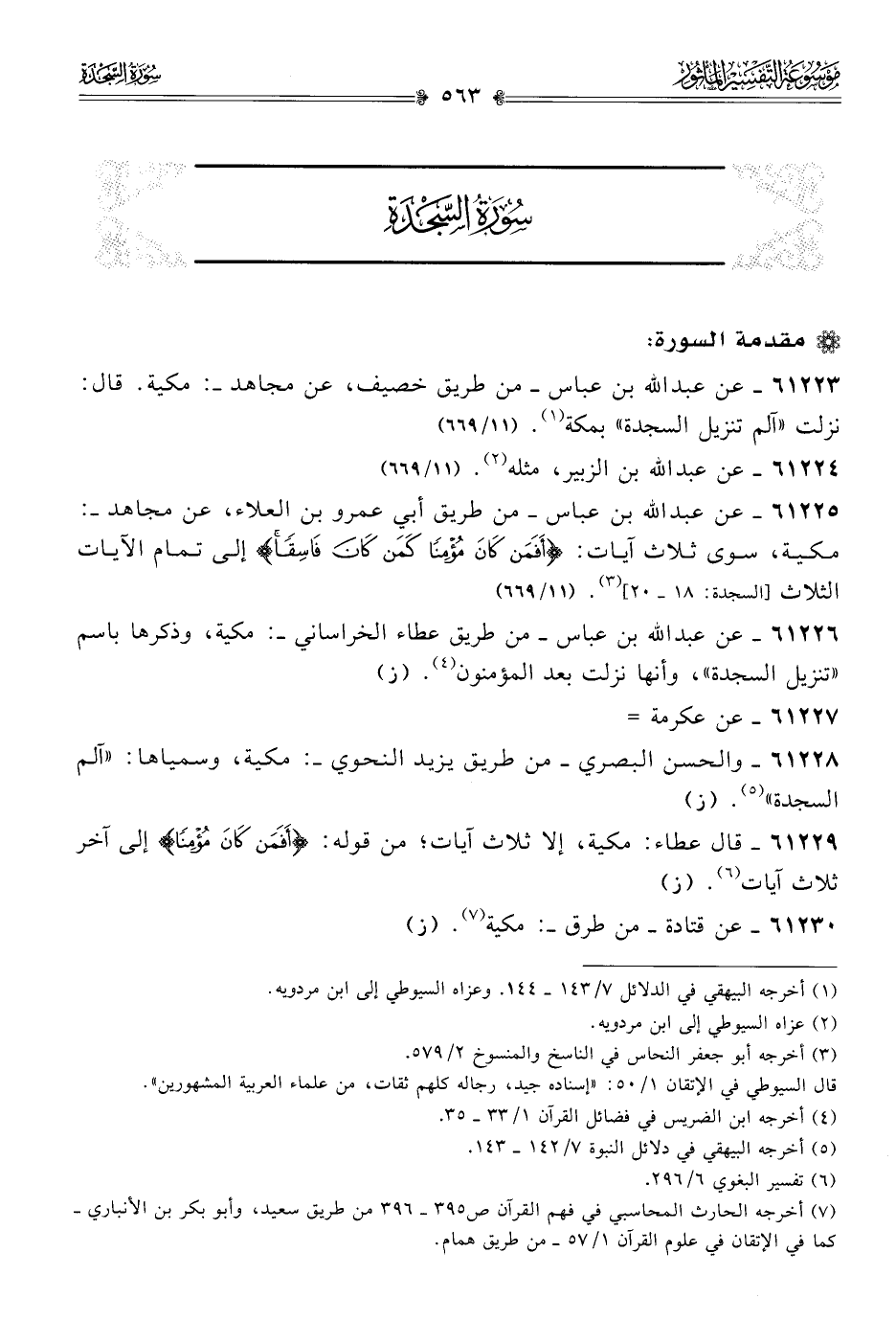 ٦١٢٢٦ - عن عبد الله بن عباس -من طريق عطاء الخراساني-: مكية، وذكرها باسم «تنزيل، السجدة»، وأنها نزلت بعد المؤمنون (¬٤). (ز)