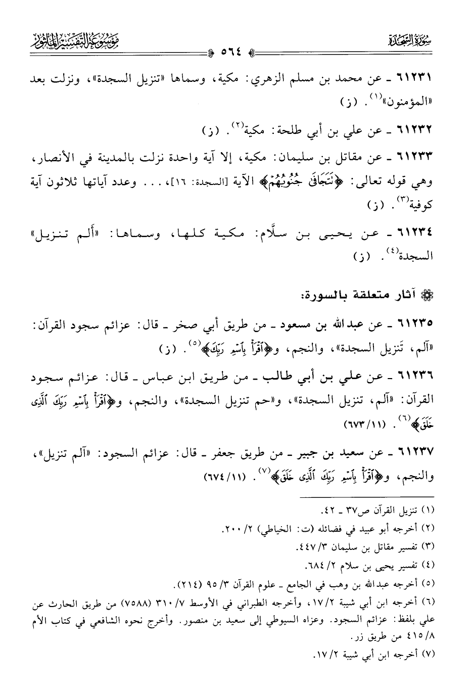 ٦١٢٣١ - عن محمد بن مسلم الزهري: مكية، وسماها «تنزيل، السجدة»، ونزلت بعد «المؤمنون» (¬١). (ز)