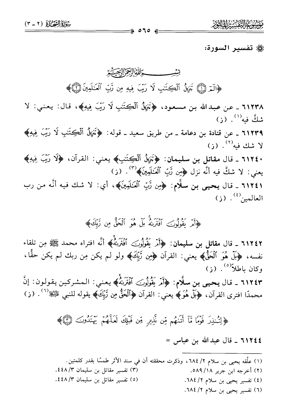 ٦١٢٣٨ - عن عبد الله بن مسعود، {تَنْزِيلُ الكِتابِ لا رَيْبَ فِيهِ}، قال: يعني: لا شكَّ فيه (¬١). (ز)