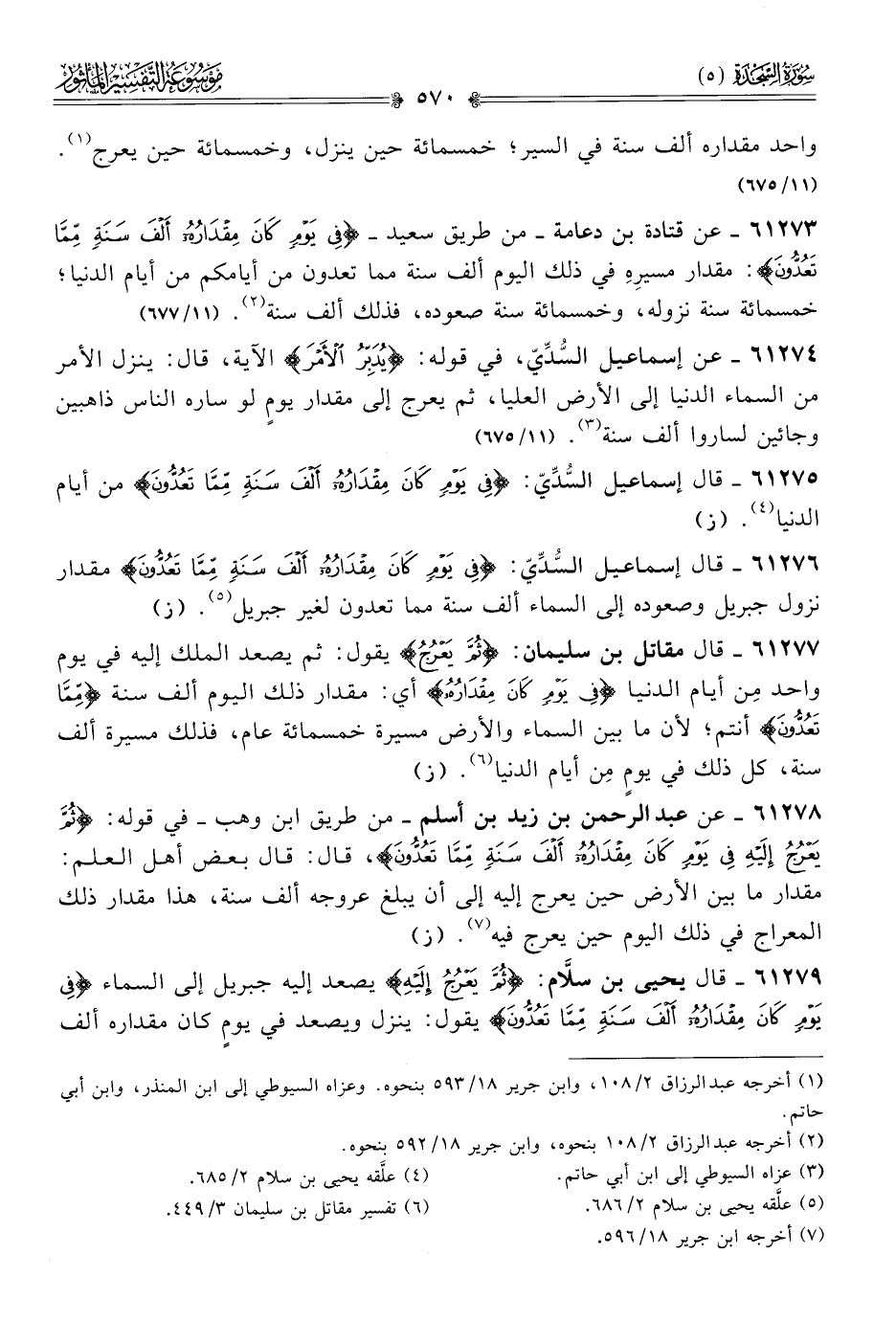 ٦١٢٧٣ - عن قتادة بن دعامة -من طريق سعيد- {فِي يَوْمٍ كانَ مِقْدارُهُ ألْفَ سَنَةٍ مِمّا تَعُدُّونَ}: مقدار مسيرِهِ في ذلك اليوم ألف سنة مما تعدون من أيامكم من أيام الدنيا؛ خمسمائة سنة نزوله، وخمسمائة سنة صعوده، فذلك ألف سنة (¬٢). (١١/ ٦٧٧)