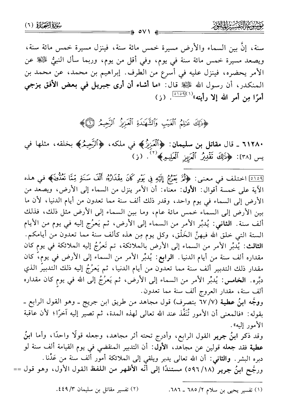 [٥١٥٩] اختلف في معنى: {ثُمَّ يَعْرُجُ إلَيْهِ فِي يَوْمٍ كانَ مِقْدارُهُ ألْفَ سَنَةٍ مِمّا تَعُدُّونَ} في هذه الآية على خمسة أقوال: الأول: معناه أن الأمر ينزل من السماء إلى الأرض، ويصعد من الأرض إلى السماء في يوم واحد، وقدر ذلك ألف سنة مما تعدون من أيام الدنيا، لأن ما بين الأرض إلى السماء خمس مائة عام، وما بين السماء إلى الأرض مثل ذلك، فذلك ألف سنة. الثاني: يُدبِّر الأمر من السماء إلى الأرض، ثم يَعرُج إليه في يوم من الأيام الستة التي خلق الله فيهنَّ الخَلْق، وكل يوم مِن هذه كألف سنة مما تعدون من أيامكم. الثالث: يُدبِّر الأمر من السماء إلى الأرض بالملائكة، تم تَعرُجُ إليه الملائكة في يومٍ كان مقداره ألف سنة من أيام الدنيا. الرابع: يُدبِّر الأمر من السماء إلى الأرض في يومٍ، كان مقدار ذلك التدبير ألف سنة مما تعدون من أيام الدنيا، ثم يَعرُجُ إليه ذلك التدبير الذي دبَّره. الخامس: يُدبِّر الأمر من السماء إلى الأرض، ثم يَعرُجُ إلى الله في يومٍ كان مقداره ألف سنة، مقدار العروج ألف سنة مما تعدون.