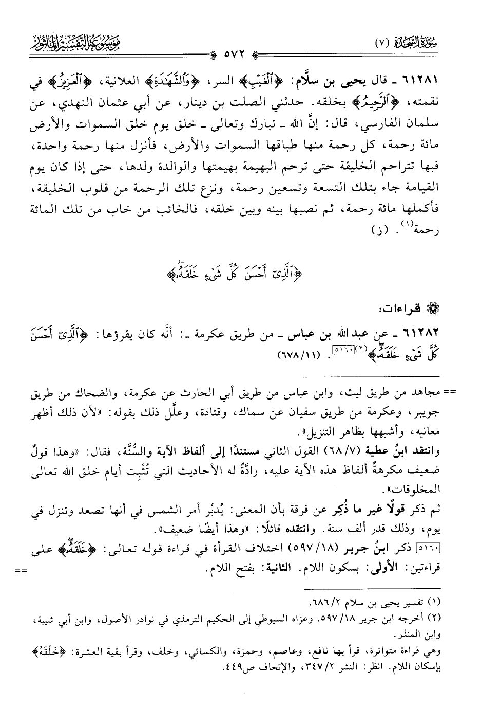 ٦١٢٨٢ - عن عبد الله بن عباس -من طريق عكرمة- أنّه كان يقرؤها: {الَّذِي أحْسَنَ كُلَّ شَيْءٍ خَلَقَهُ} (¬٢) [٥١٦٠]. (١١/ ٦٧٨)