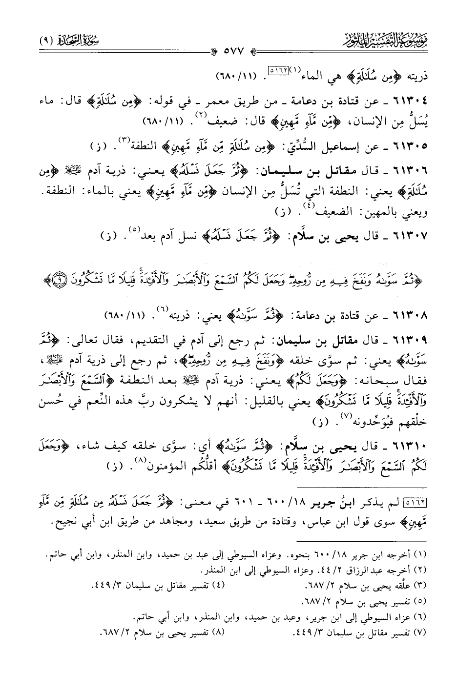 [٥١٦٢] لم يذكر ابنُ جرير ١٨/ ٦٠٠ - ٦٠١ في معنى: {ثُمَّ جَعَلَ نَسْلَهُ مِن سُلالَةٍ مِن ماءٍ مَهِينٍ} سوى قول ابن عباس، وقتادة من طريق سعيد، ومجاهد من طريق ابن أبي نجيح.