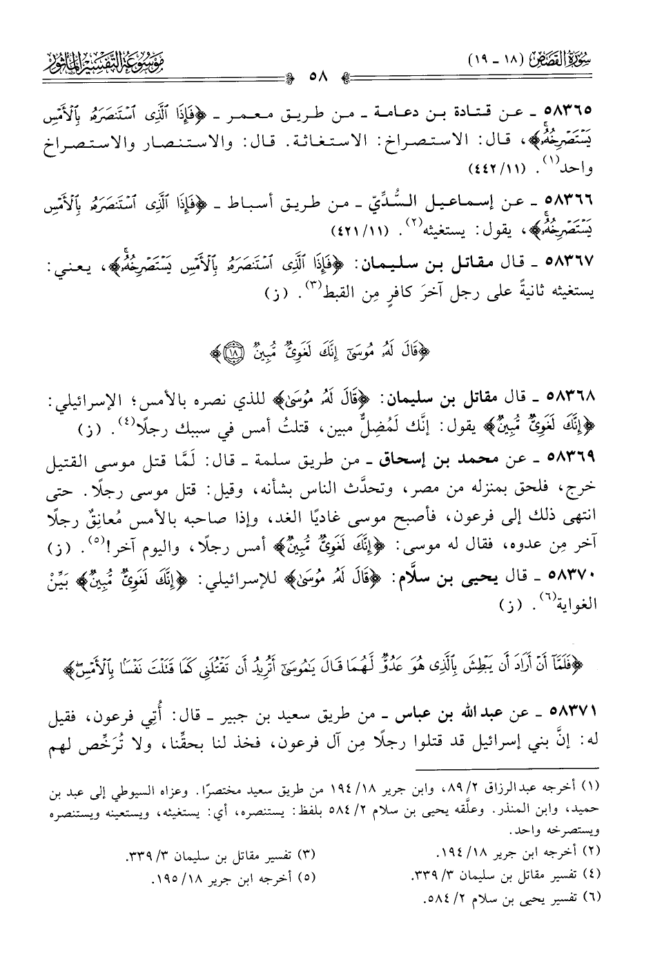 ٥٨٣٦٦ - عن إسماعيل السُّدِّيّ -من طريق أسباط- {فإذا الذي استنصره بالأمس يستصرخه}، يقول: يستغيثه (¬٢). (١١/ ٤٢١)