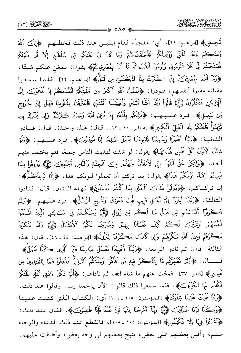 مَحِيصٍ} [إبراهيم: ٢١]، أي: ملجأ، فقام إبليس عند ذلك فخطبهم: {إنَّ اللَّهَ وعَدَكُمْ وعْدَ الحَقِّ ووَعَدْتُكُمْ فَأَخْلَفْتُكُمْ وما كانَ لِيَ عَلَيْكُمْ مِن سُلْطانٍ إلّا أنْ دَعَوْتُكُمْ فاسْتَجَبْتُمْ لِي فَلا تَلُومُونِي ولُومُوا أنْفُسَكُمْ ما أنا بِمُصْرِخِكُمْ} يقول: بمغنٍ عنكم شيئًا، {وما أنْتُمْ بِمُصْرِخِيَّ إنِّي كَفَرْتُ بِما أشْرَكْتُمُونِ مِن قَبْلُ} [إبراهيم: ٢٢]. فلما سمعوا مقالته مقتوا أنفسهم، فنودوا: {لَمَقْتُ اللَّهِ أكْبَرُ مِن مَقْتِكُمْ أنْفُسَكُمْ إذْ تُدْعَوْنَ إلى الإيمانِ فَتَكْفُرُونَ. قالُوا رَبَّنا أمَتَّنا اثْنَتَيْنِ وأَحْيَيْتَنا اثْنَتَيْنِ فاعْتَرَفْنا بِذُنُوبِنا فَهَلْ إلى خُرُوجٍ مِن سَبِيلٍ}. فرد عليهم: {ذَلِكُمْ بِأَنَّهُ إذا دُعِيَ اللَّهُ وحْدَهُ كَفَرْتُمْ وإنْ يُشْرَكْ بِهِ تُؤْمِنُوا فالحُكْمُ لِلَّهِ العَلِيِّ الكَبِيرِ} [غافر: ١٠ - ١٢]. قال: هذه واحدة. قال: فنادوا الثانية: {رَبَّنا أبْصَرْنا وسَمِعْنا فارْجِعْنا نَعْمَلْ صالِحًا إنّا مُوقِنُونَ}. فرد عليهم: {ولَوْ شِئْنا لَآتَيْنا كُلَّ نَفْسٍ هُداها} يقول: لو شئت لهديت الناس جميعًا فلم يختلف منهم أحد، {ولَكِنْ حَقَّ القَوْلُ مِنِّي لَأَمْلَأَنَّ جَهَنَّمَ مِنَ الجِنَّةِ والنّاسِ أجْمَعِينَ فَذُوقُوا بِما نَسِيتُمْ لِقاءَ يَوْمِكُمْ هَذا} يقول: بما تركتم أن تعملوا ليومكم هذا، {إنّا نَسِيناكُمْ}: إنا تركناكم، {وذُوقُوا عَذابَ الخُلْدِ بِما كُنْتُمْ تَعْمَلُونَ} فهذه اثنتان. قال: فنادوا الثالثة: {رَبَّنا أخِّرْنا إلى أجَلٍ قَرِيبٍ نُجِبْ دَعْوَتَكَ ونَتَّبِعِ الرُّسُلَ}. فرد عليهم: {أوَلَمْ تَكُونُوا أقْسَمْتُمْ مِن قَبْلُ ما لَكُمْ مِن زَوالٍ. وسَكَنْتُمْ فِي مَساكِنِ الَّذِينَ ظَلَمُوا أنْفُسَهُمْ وتَبَيَّنَ لَكُمْ كَيْفَ فَعَلْنا بِهِمْ وضَرَبْنا لَكُمُ الأَمْثالَ. وقَدْ مَكَرُوا مَكْرَهُمْ وعِنْدَ اللَّهِ مَكْرُهُمْ وإنْ كانَ مَكْرُهُمْ لِتَزُولَ مِنهُ الجِبالُ} [إبراهيم: ٤٤ - ٤٦]. قال: هذه الثالثة. قال: ثم نادوا الرابعة: {ربنا أخرجنا نعمل صالحا غير الذي كنا نعمل}. قال: {أوَلَمْ نُعَمِّرْكُمْ ما يَتَذَكَّرُ فِيهِ مَن تَذَكَّرَ وجاءَكُمُ النَّذِيرُ فَذُوقُوا فَما لِلظّالِمِينَ مِن نَصِيرٍ} [فاطر: ٣٧]. فمكث عنهم ما شاء الله، ثم ناداهم: {ألَمْ تَكُنْ آياتِي تُتْلى عَلَيْكُمْ فَكُنْتُمْ بِها تُكَذِّبُونَ}. فلما سمعوا ذلك قالوا: الآن يرحمنا ربنا. وقالوا عند ذلك: {رَبَّنا غَلَبَتْ عَلَيْنا شِقْوَتُنا} [المؤمنون: ١٠٥ - ١٠٦] أي: الكتاب الذي كتبت علينا {وكُنّا قَوْمًا ضالِّينَ. رَبَّنا أخْرِجْنا مِنها فَإنْ عُدْنا فَإنّا ظالِمُونَ}. فقال عند ذلك: {اخْسَئُوا فِيها ولا تُكَلِّمُونِ} [المؤمنون: ١٠٥ - ١٠٨]، فانقطع عند ذلك الدعاء والرجاء منهم، وأقبل بعضهم على بعض، ينبح بعضهم في وجه بعض، وأطبقت عليهم.
