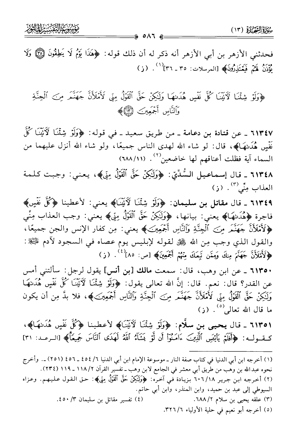 ٦١٣٥٠ - عن ابن وهب، قال: سمعت مالك [بن أنس] يقول لرجل: سألتني أمس عن القدر؟ قال: نعم. قال: إنّ الله تعالى يقول: {ولو شئنا لآتينا كل نفس هداها ولكن حق القول مني لأملأن جهنم من الجنة والناس أجمعين}، فلا بدَّ مِن أن يكون ما قال الله تعالى (¬٥). (ز)