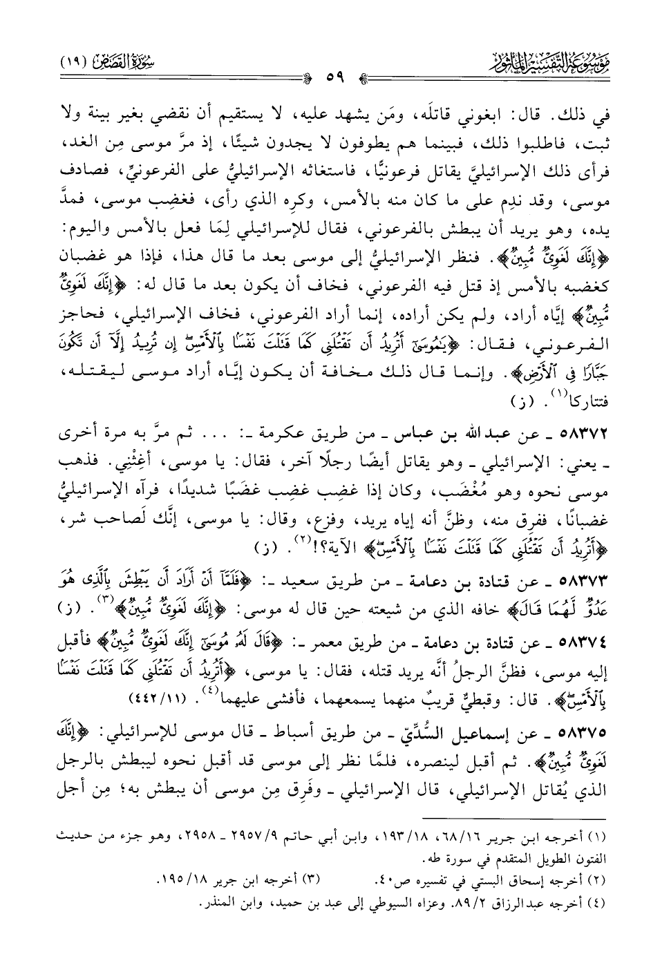 ٥٨٣٧٥ - عن إسماعيل السُّدِّيّ -من طريق أسباط- قال موسى للإسرائيلي: {إنك لغوي مبين}. ثم أقبل لينصره، فلمّا نظر إلى موسى قد أقبل نحوه ليبطش بالرجل الذي يُقاتل الإسرائيلي، قال الإسرائيلي -وفَرِق مِن موسى أن يبطش به؛ مِن أجل