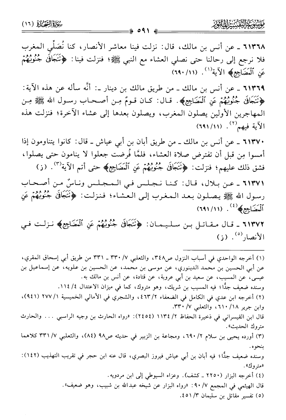٦١٣٧١ - عن بلال، قال: كنا نجلس في المجلس وناسٌ من أصحاب رسول الله - صلى الله عليه وسلم - يصلون بعد المغرب إلى العشاء؛ فنزلت: {تَتَجافى جنُوبهم عَن المضاجِع} (¬٤). (١١/ ٦٩١)