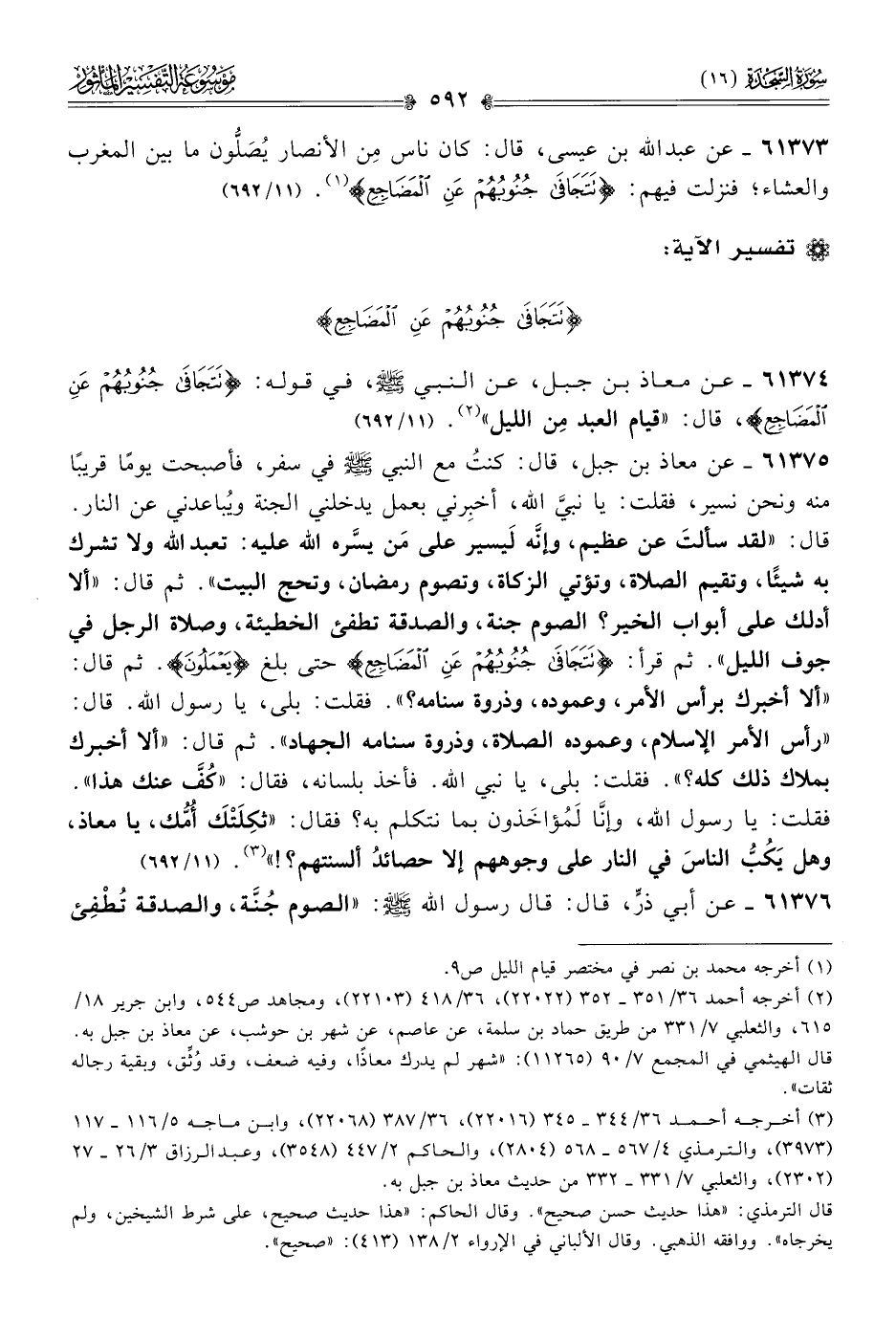 ٦١٣٧٤ - عن معاذ بن جبل، عن النبي - صلى الله عليه وسلم -، في قوله: {تَتَجافى جنُوبهم عَن المضاجِع}، قال: «قيام العبد مِن الليل» (¬٢). (١١/ ٦٩٢)