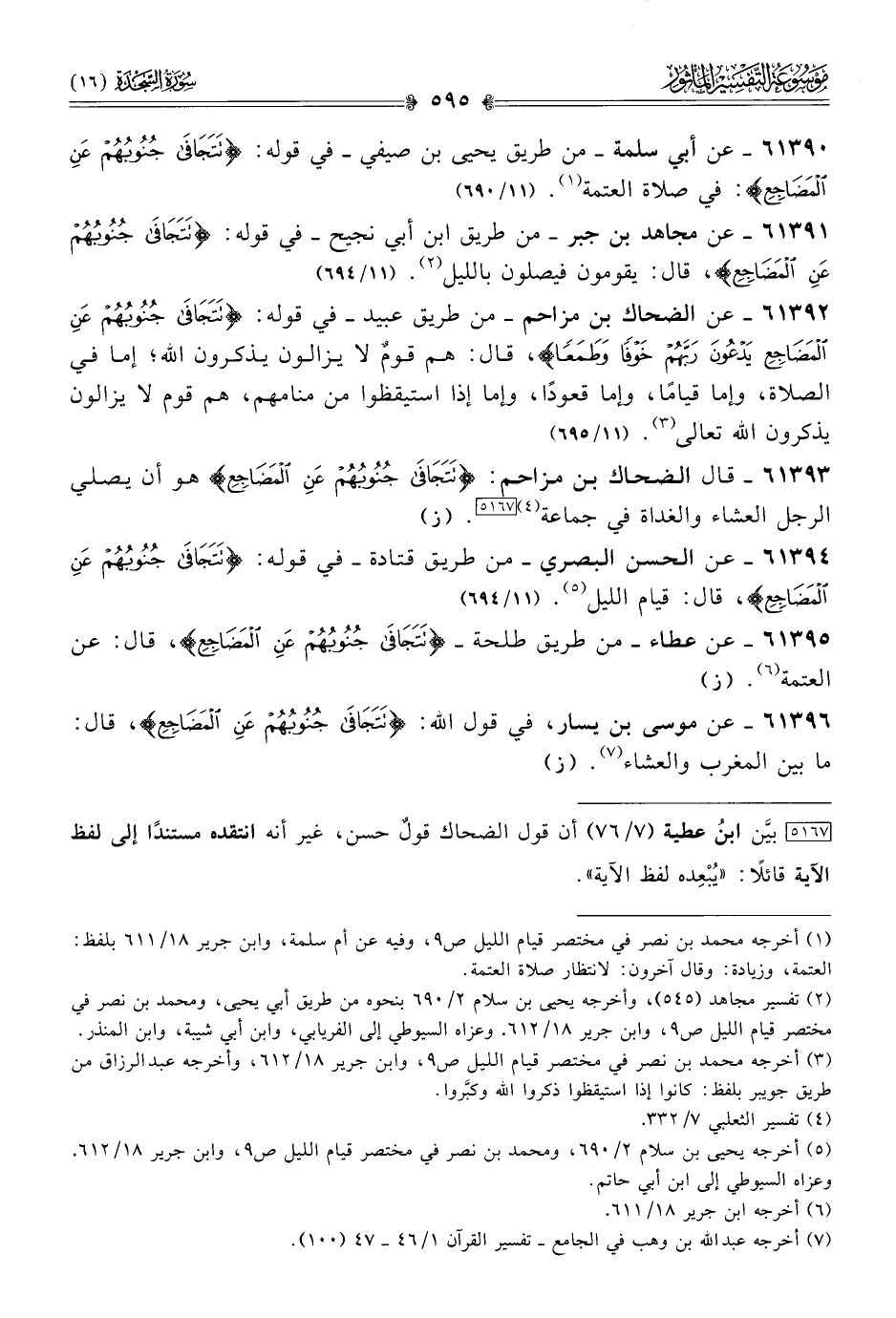 ٦١٣٩٥ - عن عطاء -من طريق طلحة- {تَتَجافى جُنُوبُهُمْ عَنِ المَضاجِعِ}، قال: عن العتمة (¬٦). (ز)