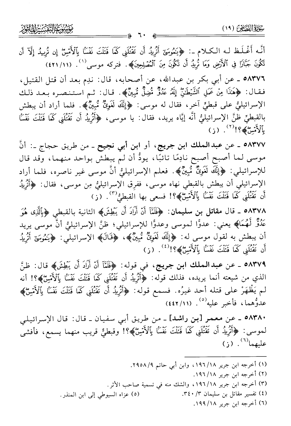 ٥٨٣٧٦ - عن أبي بكر بن عبد الله، عن أصحابه، قال: ندِم بعد أن قتل القتيل، فقال: {هذا من عمل الشيطان، إنه عدو مضل مبين}. قال: ثم استنصره بعد ذلك الإسرائيليُّ على قبطيٍّ آخر، فقال له موسى: {إنك لغوي مبين}. فلما أراد أن يبطش بالقبطيِّ ظنَّ الإسرائيليُّ أنّه إيّاه يريد، فقال: يا موسى، {أتريد أن تقتلني كما قتلت نفسا بالأمس}؟! (¬٢). (ز)