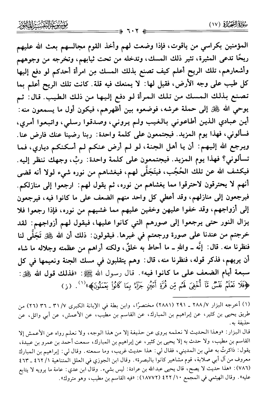 المؤمنين بكراسي من ياقوت، فإذا وضعت لهم وأخذ القوم مجالسهم بعث الله عليهم ريحًا تدعى المثيرة، تثير ذلك المسك، وتدخله من تحت ثيابهم، وتخرجه من وجوههم وأشعارهم، تلك الريح أعلم كيف تصنع بذلك المسك مِن امرأة أحدكم لو دفع إليها كل طيب على وجه الأرض، فقيل لها: لا يمنعك فيه قلة. كانت تلك الريح أعلم بما تصنع بذلك المسك من تلك المرأة لو دفع إليها من ذلك الطيب. قال: ثم يوحي الله - عز وجل - إلى حملة عرشه، فوضعوه بين أظهرهم، فيكون أول ما يسمعون منه: أين عبادي الذين أطاعوني بالغيب ولم يروني، وصدقوا رسلي، واتبعوا أمري، فسألوني، فهذا يوم المزيد. فيجتمعون على كلمة واحدة: ربنا رضينا عنك فارض عنا. ويرجع الله إليهم: أن يا أهل الجنة، لو لم أرض عنكم لم أسكنكم دياري، فما تسألوني؟ فهذا يوم المزيد. فيجتمعون على كلمة واحدة: ربِّ، وجهك ننظر إليه. فيكشف الله عن تلك الحُجُب، فيتَجَلّى لهم، فيغشاهم من نوره شيء لولا أنه قضى أنهم لا يحترقون لاحترقوا مما يغشاهم من نوره، ثم يقول لهم: ارجعوا إلى منازلكم. فيرجعون إلى منازلهم، وقد أعطي كل واحد منهم الضعف على ما كانوا فيه، فيرجعون إلى أزواجهم، وقد خفوا عليهن وخفين عليهم مما غشيهم من نوره، فإذا رجعوا فلا يزال النور حتى يرجعوا إلى صورهم التي كانوا عليها، فيقول لهم أزواجهم: لقد خرجتم من عندنا على صورة ورجعتم في غيرها. فيقولون: ذلك أن الله - عز وجل - تَجَلّى لنا فنظرنا منه. قال: إنّه -واللهِ- ما أحاط به خلقٌ، ولكنه أراهم من عظمته وجلاله ما شاء أن يريهم، فذكر قوله، فنظرنا منه، قال: وهم يتقلبون في مسك الجنة ونعيمها في كل سبعة أيام الضعف على ما كانوا فيه». قال رسول الله - صلى الله عليه وسلم -: «فذلك قول الله - عز وجل -: {فَلا تَعْلَمُ نَفْسٌ ما أُخْفِيَ لَهُمْ مِن قُرَّةِ أعْيُنٍ جَزاءً بِما كانُوا يَعْمَلُونَ}» (¬١). (ز)