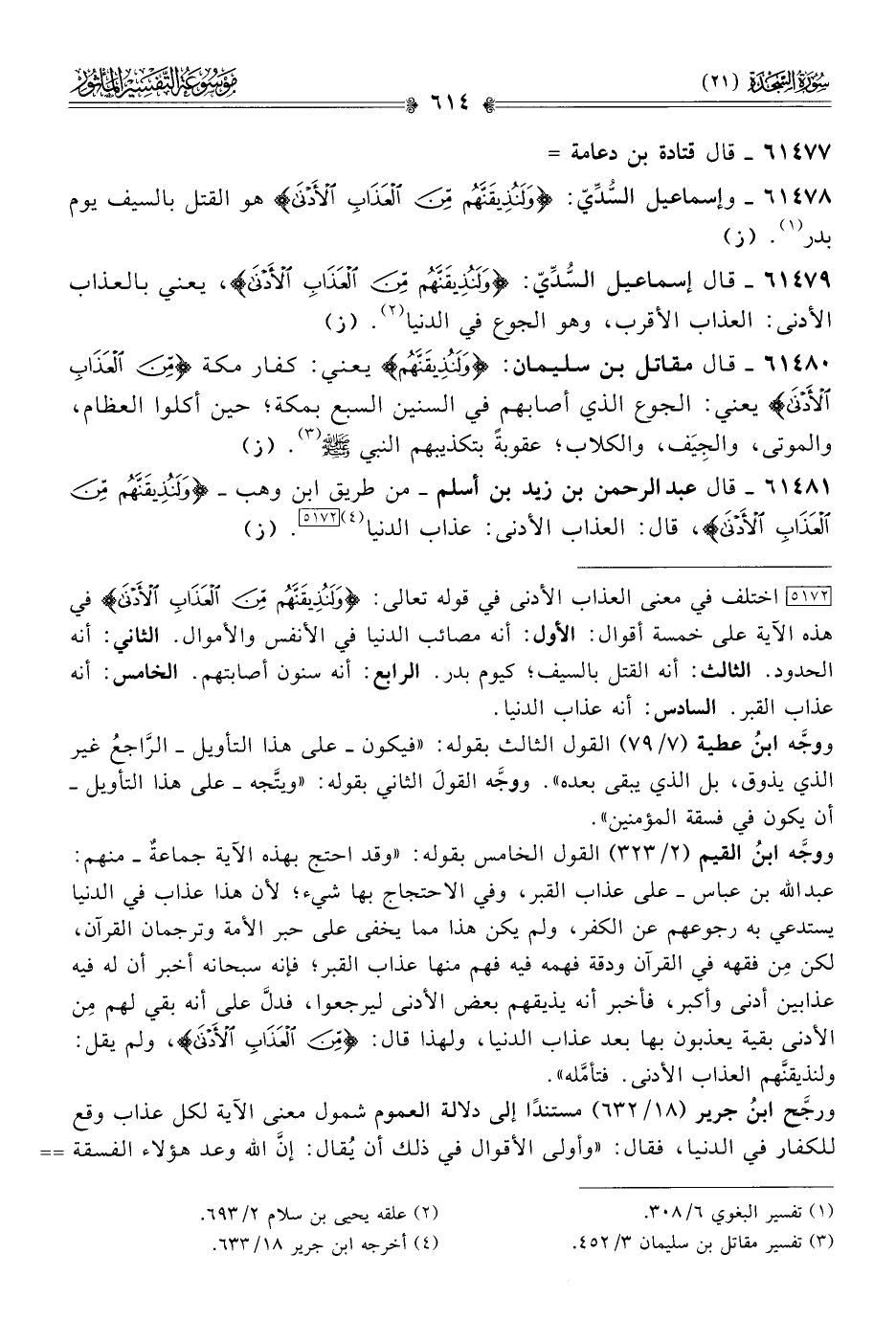 ٦١٤٧٩ - قال إسماعيل السُّدِّيّ: {ولَنُذِيقَنَّهُمْ مِنَ العَذابِ الأَدْنى}، يعني بالعذاب الأدنى: العذاب الأقرب، وهو الجوع في الدنيا (¬٢). (ز)