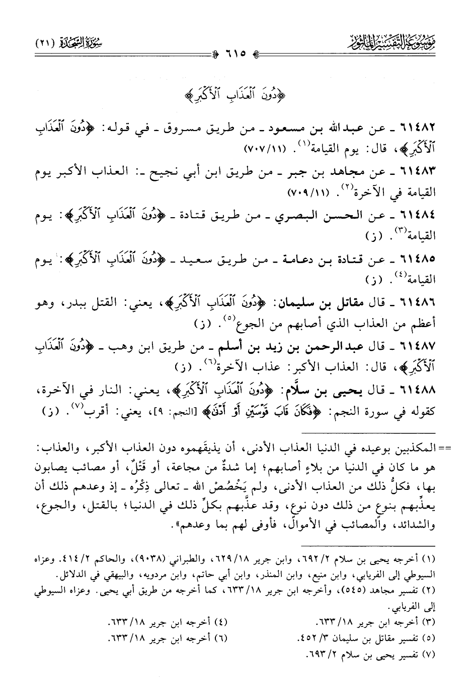 ٦١٤٨٦ - قال مقاتل بن سليمان: {دُونَ العَذابِ الأَكْبَرِ}، يعني: القتل ببدر، وهو أعظم من العذاب الذي أصابهم من الجوع (¬٥). (ز)