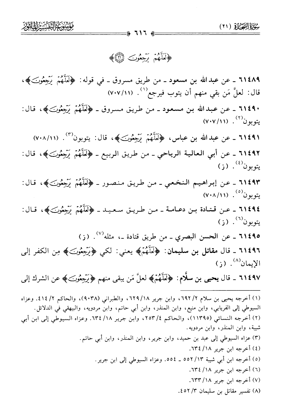 ٦١٤٩٣ - عن إبراهيم النخعي -من طريق منصور- {لَعَلَّهُمْ يَرْجِعُونَ}، قال: يتوبون (¬٥). (١١/ ٧٠٨)