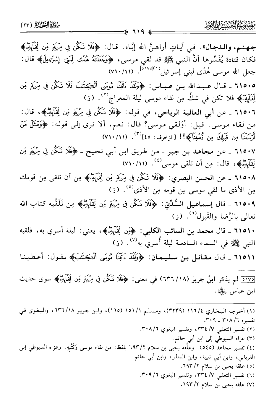 [٥١٧٥] لم يذكر ابنُ جرير (١٨/ ٦٣٦) في معنى: {فَلا تَكُنْ فِي مِرْيَةٍ مِن لِقائِهِ} سوى حديث ابن عباس - رضي الله عنهما -.