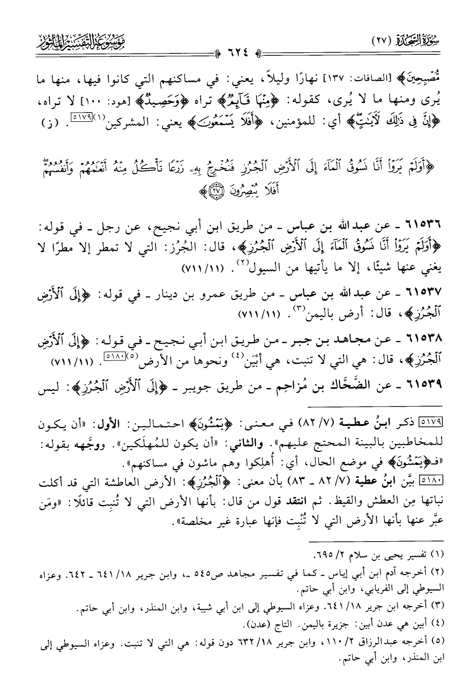 ٦١٥٣٧ - عن عبد الله بن عباس -من طريق عمرو بن دينار- في قوله: {إلى الأَرْضِ الجُرُزِ}، قال: أرض باليمن (¬٣). (١١/ ٧١١)