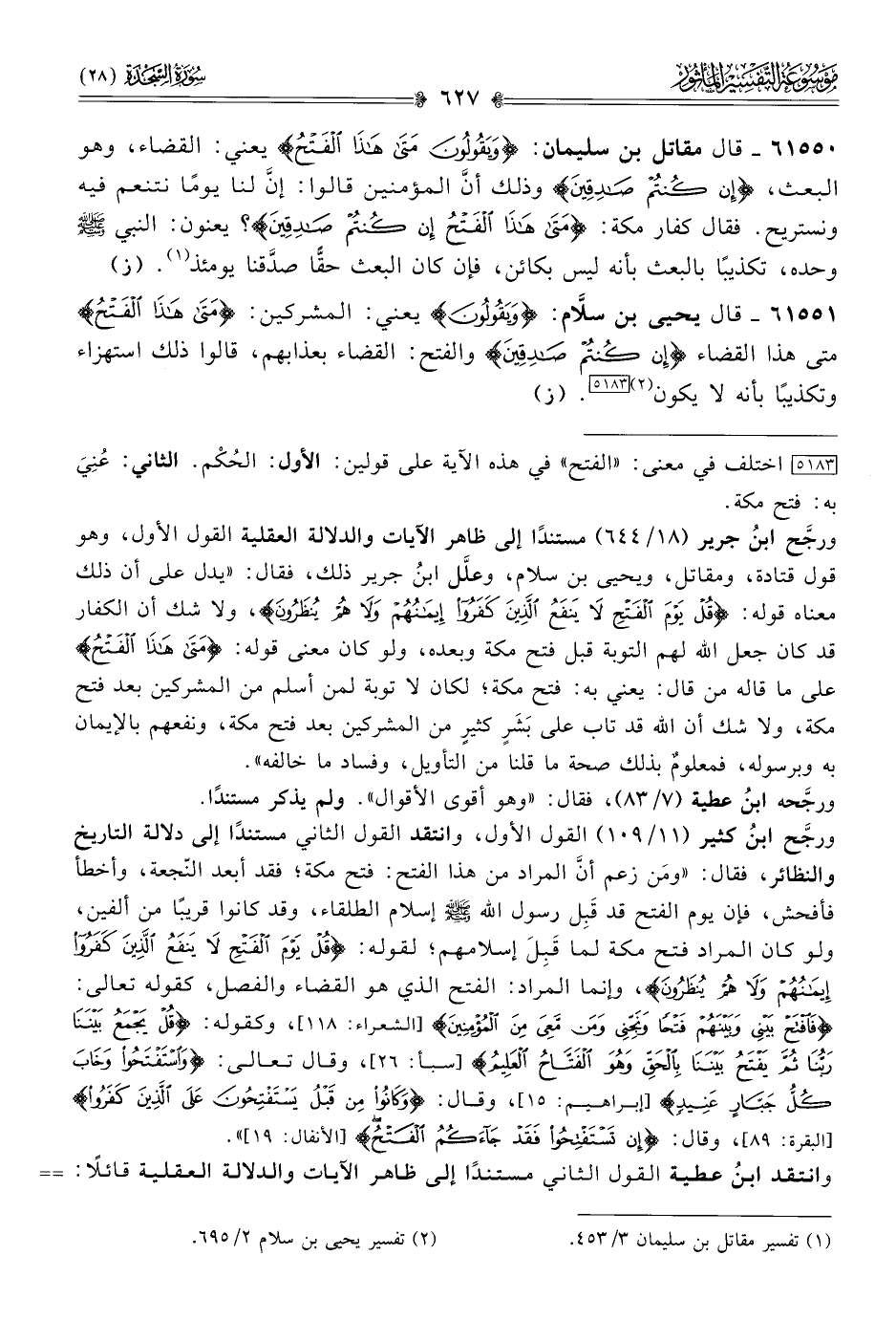 ورجَّح ابنُ كثير (١١/ ١٠٩) القول الأول، وانتقد القول الثاني مستندًا إلى دلالة التاريخ والنظائر، فقال: «ومَن زعم أنّ المراد من هذا الفتح: فتح مكة؛ فقد أبعد النّجعة، وأخطأ فأفحش، فإن يوم الفتح قد قَبِل رسول الله - صلى الله عليه وسلم - إسلام الطلقاء، وقد كانوا قريبًا من ألفين، ولو كان المراد فتح مكة لما قَبِلَ إسلامهم؛ لقوله: {قُلْ يَوْمَ الفَتْحِ لا يَنْفَعُ الَّذِينَ كَفَرُوا إيمانُهُمْ ولا هُمْ يُنْظَرُونَ}، وإنما المراد: الفتح الذي هو القضاء والفصل، كقوله تعالى: {فافْتَحْ بَيْنِي وبَيْنَهُمْ فَتْحًا ونَجِّنِي ومَن مَعِيَ مِنَ المُؤْمِنِينَ} [الشعراء: ١١٨]، وكقوله: {قُلْ يَجْمَعُ بَيْنَنا رَبُّنا ثُمَّ يَفْتَحُ بَيْنَنا بِالحَقِّ وهُوَ الفَتّاحُ العَلِيمُ} [سبأ: ٢٦]، وقال تعالى: {واسْتَفْتَحُوا وخابَ كُلُّ جَبّارٍ عَنِيدٍ} [إبراهيم: ١٥]، وقال: {وكانُوا مِن قَبْلُ يَسْتَفْتِحُونَ عَلى الَّذِينَ كَفَرُوا} [البقرة: ٨٩]، وقال: {إنْ تَسْتَفْتِحُوا فَقَدْ جاءَكُمُ الفَتْحُ} [الأنفال: ١٩]».