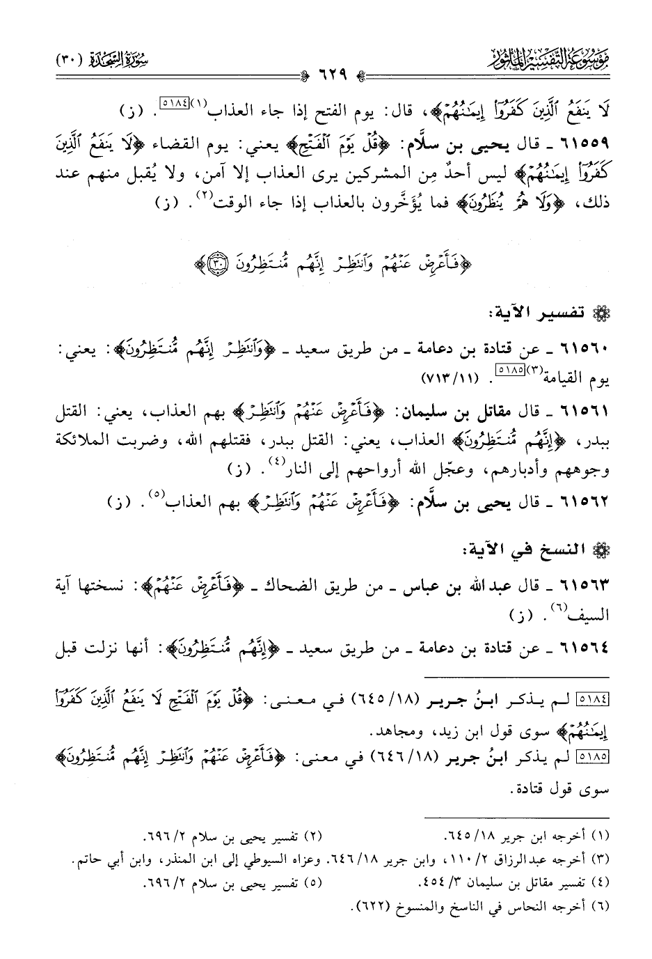 [٥١٨٥] لم يذكر ابنُ جرير (١٨/ ٦٤٦) في معنى: {فَأَعْرِضْ عَنْهُمْ وانْتَظِرْ إنَّهُمْ مُنْتَظِرُونَ} سوى قول قتادة.