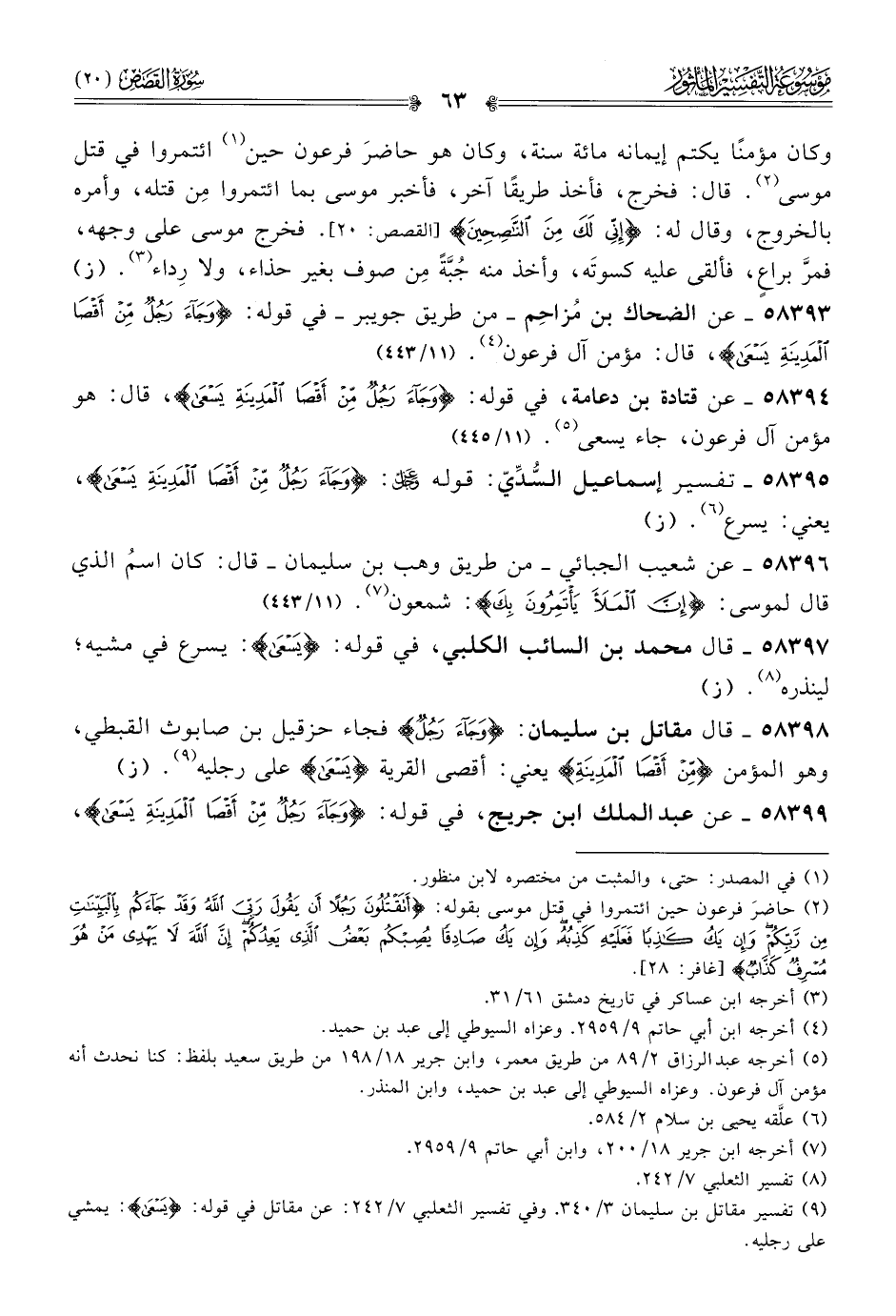 ٥٨٣٩٣ - عن الضحاك بن مُزاحِم -من طريق جويبر- في قوله: {وجاء رجل من أقصى المدينة يسعى}، قال: مؤمن آل فرعون (¬٤). (١١/ ٤٤٣)