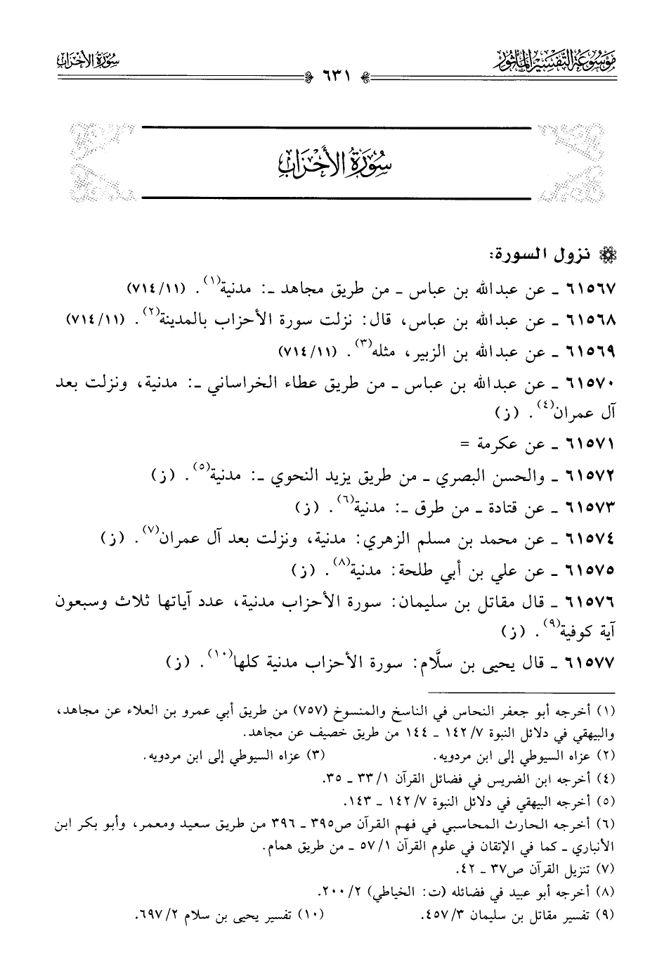 ٦١٥٦٨ - عن عبد الله بن عباس، قال: نزلت سورة الأحزاب بالمدينة (¬٢). (١١/ ٧١٤)