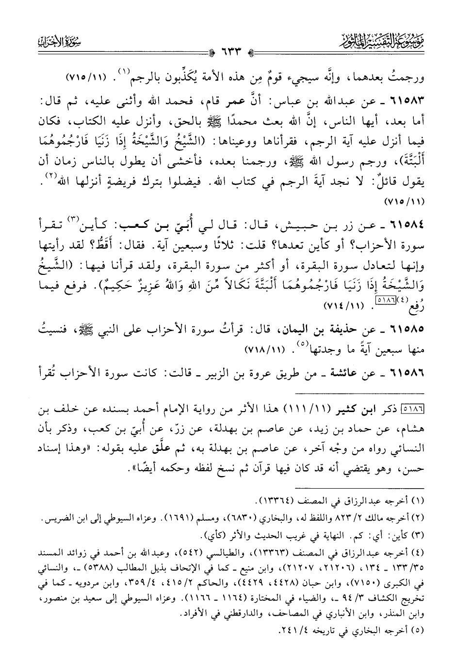 ٦١٥٨٤ - عن زر بن حبيش، قال: قال لي أُبَيّ بن كعب: كأين (¬٣) تقرأ سورة الأحزاب؟ أو كأين تعدها؟ قلت: ثلاثًا وسبعين آية. فقال: أقَطُّ؟ لقد رأيتها وإنها لتعادل سورة البقرة، أو أكثر من سورة البقرة، ولقد قرأنا فيها: (الشَّيخُ والشَّيْخَةُ إذا زَنَيا فارْجُمُوهُما ألْبَتَّةَ نَكالًا مِّنَ اللهِ واللهُ عَزِيزٌ حَكِيمٌ). فرفع فيما رُفِع (¬٤) [٥١٨٦]. (١١/ ٧١٤)