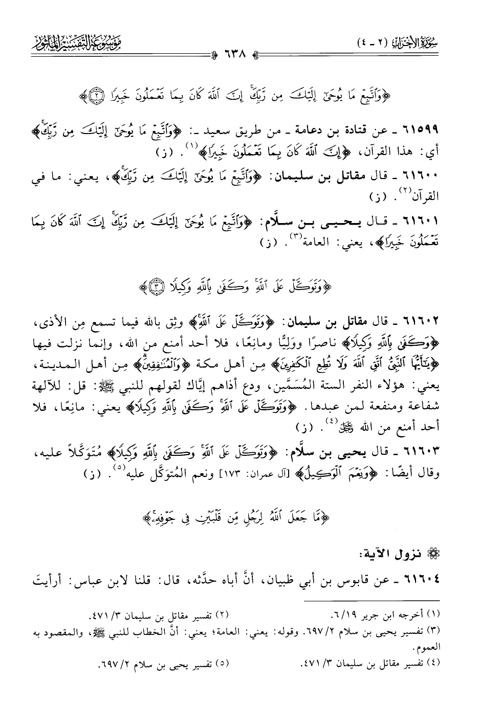 ٦١٦٠١ - قال يحيى بن سلّام: {واتَّبِعْ ما يُوحى إلَيْكَ مِن رَبِّكَ إنَّ اللَّهَ كانَ بِما تَعْمَلُونَ خَبِيرًا}، يعني: العامة (¬٣). (ز)