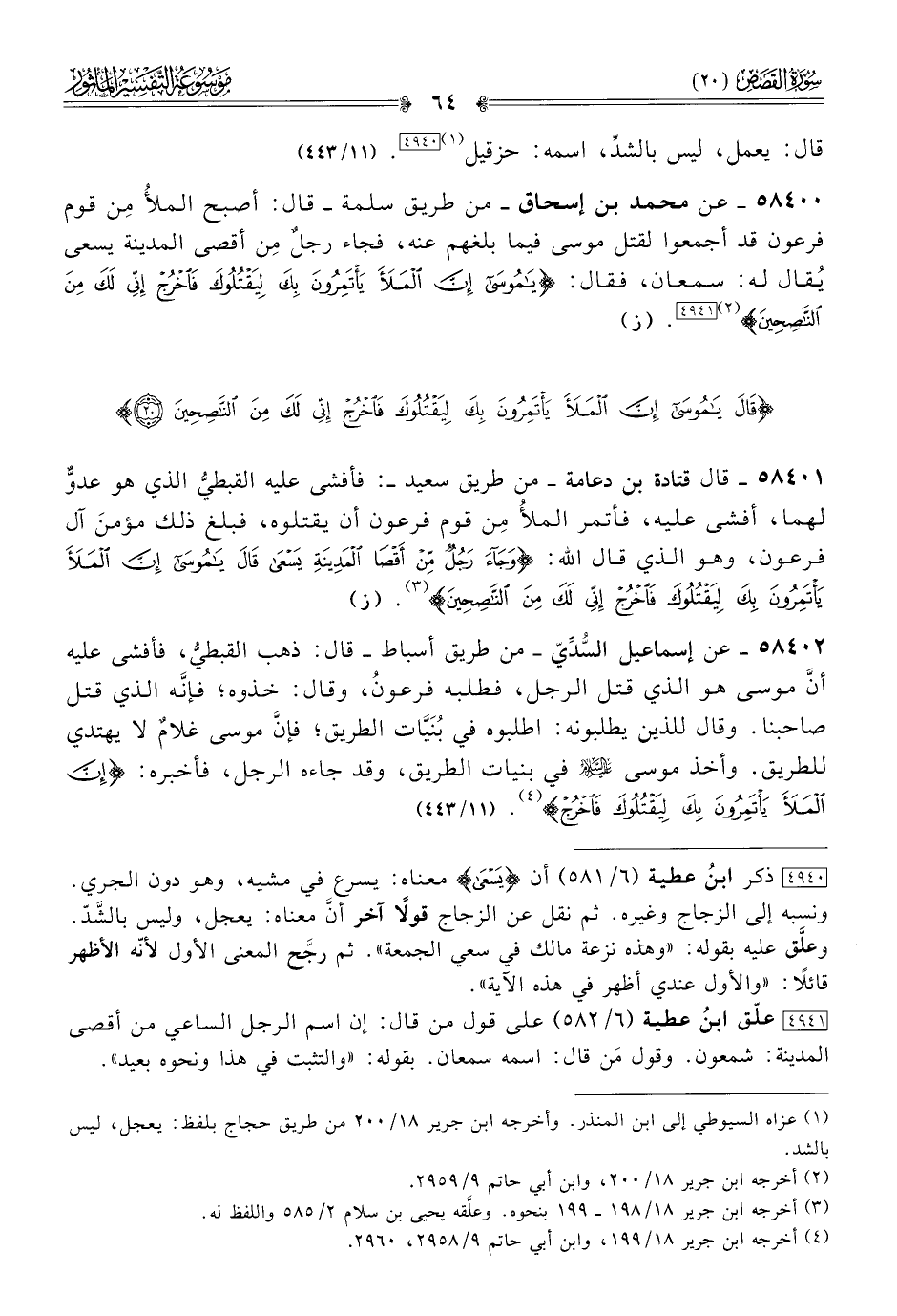 ٥٨٤٠٠ - عن محمد بن إسحاق -من طريق سلمة- قال: أصبح الملأُ مِن قوم فرعون قد أجمعوا لقتل موسى فيما بلغهم عنه، فجاء رجلٌ مِن أقصى المدينة يسعى يُقال له: سمعان، فقال: {يا موسى إن الملأ يأتمرون بك ليقتلوك، فاخرج إني لك من الناصحين} (¬٢) [٤٩٤١]. (ز)