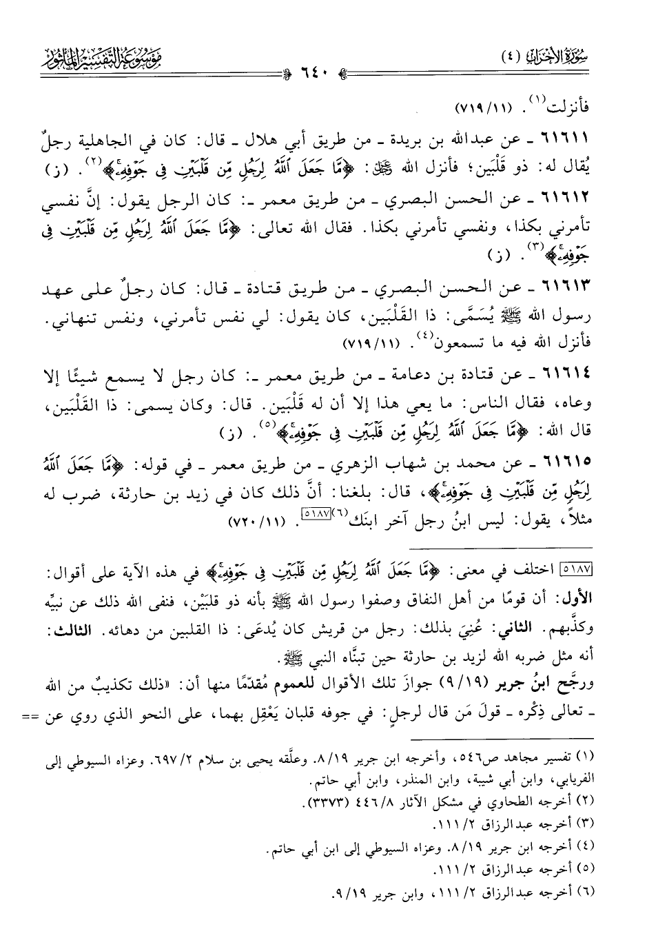 ورجَّح ابنُ جرير (١٩/ ٩) جوازَ تلك الأقوال للعموم مُقدّمًا منها أن: «ذلك تكذيبٌ من الله -تعالى ذِكْره- قولَ مَن قال لرجلٍ: في جوفه قلبان يَعْقِل بهما، على النحو الذي روي عن ابن عباس». ثم قال: «وجائزٌ أن يكون ذلك تكذيبًا مِن الله لمن وصف رسولَ الله - صلى الله عليه وسلم - بذلك، وأن يكون تكذيبًا لمن سمّى القرشيَّ الذي ذُكِر أنه سُمِّيَ: ذا القلبَيْن مِن دَهْيِه، وأيُّ الأمرَيْن كان فهو نفيٌ من الله عن خلقه من الرجال أن يكونوا بتلك الصفة».