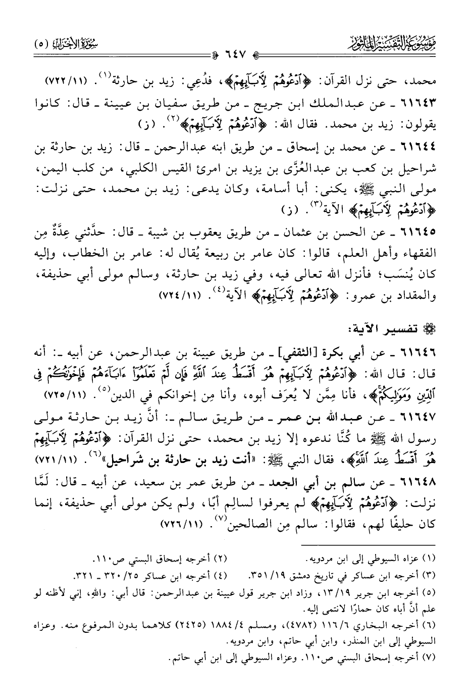 ٦١٦٤٧ - عن عبد الله بن عمر -من طريق سالم-: أنّ زيد بن حارثة مولى رسول الله - صلى الله عليه وسلم - ما كُنّا ندعوه إلا زيد بن محمد، حتى نزل القرآن: {ادْعُوهُمْ لِآبائِهِمْ هُوَ أقْسَطُ عِنْدَ اللَّهِ}، فقال النبي - صلى الله عليه وسلم -: «أنت زيد بن حارثة بن شَراحيل» (¬٦). (١١/ ٧٢١)