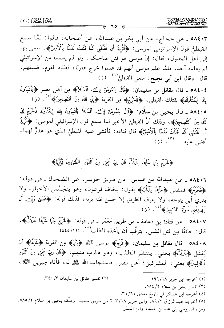 ٥٨٤٠٣ - عن حجاج، عن أبي بكر بن عبد الله، عن أصحابه، قالوا: لَمّا سمع القبطيُّ قولَ الإسرائيلي لموسى: {أتريد أن تقتلني كما قتلت نفسا بالأمس}. سعى بها إلى أهل المقتول، فقال: إنّ موسى هو قتل صاحبكم. ولو لم يسمعه من الإسرائيلي لم يعلمه أحد، فلمّا علم موسى أنهم قد علموا خرج هاربًا، فطلبه القوم، فسبقهم. قال: وقال ابن أبي نجيح: سعى القبطيُّ (¬١). (ز)