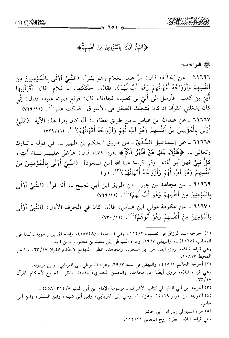 ٦١٦٧٠ - عن عكرمة مولى ابن عباس، قال: كان في الحرف الأول: (النَّبِيُّ أوْلى بِالمُؤْمِنِينَ مِن أنفُسِهِمْ وهُوَ أبُوهُمْ) (¬٥). (١١/ ٧٣٠)