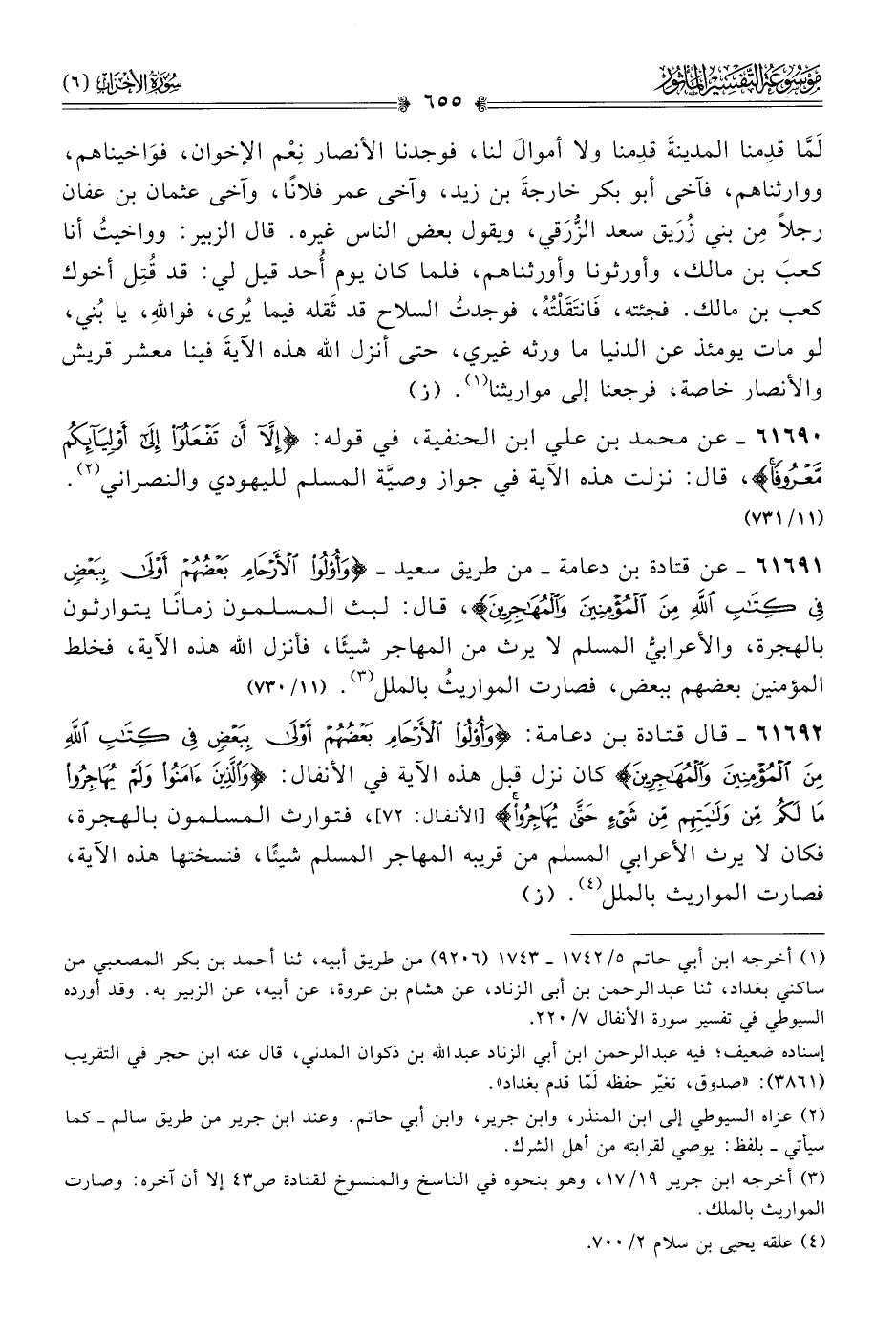 ٦١٦٩١ - عن قتادة بن دعامة -من طريق سعيد- {وأُولُو الأَرْحامِ بَعْضُهُمْ أوْلى بِبَعْضٍ فِي كِتابِ اللَّهِ مِنَ المُؤْمِنِينَ والمُهاجِرِينَ}، قال: لبث المسلمون زمانًا يتوارثون بالهجرة، والأعرابيُّ المسلم لا يرث من المهاجر شيئًا، فأنزل الله هذه الآية، فخلط المؤمنين بعضهم ببعض، فصارت المواريثُ بالملل (¬٣). (١١/ ٧٣٠)