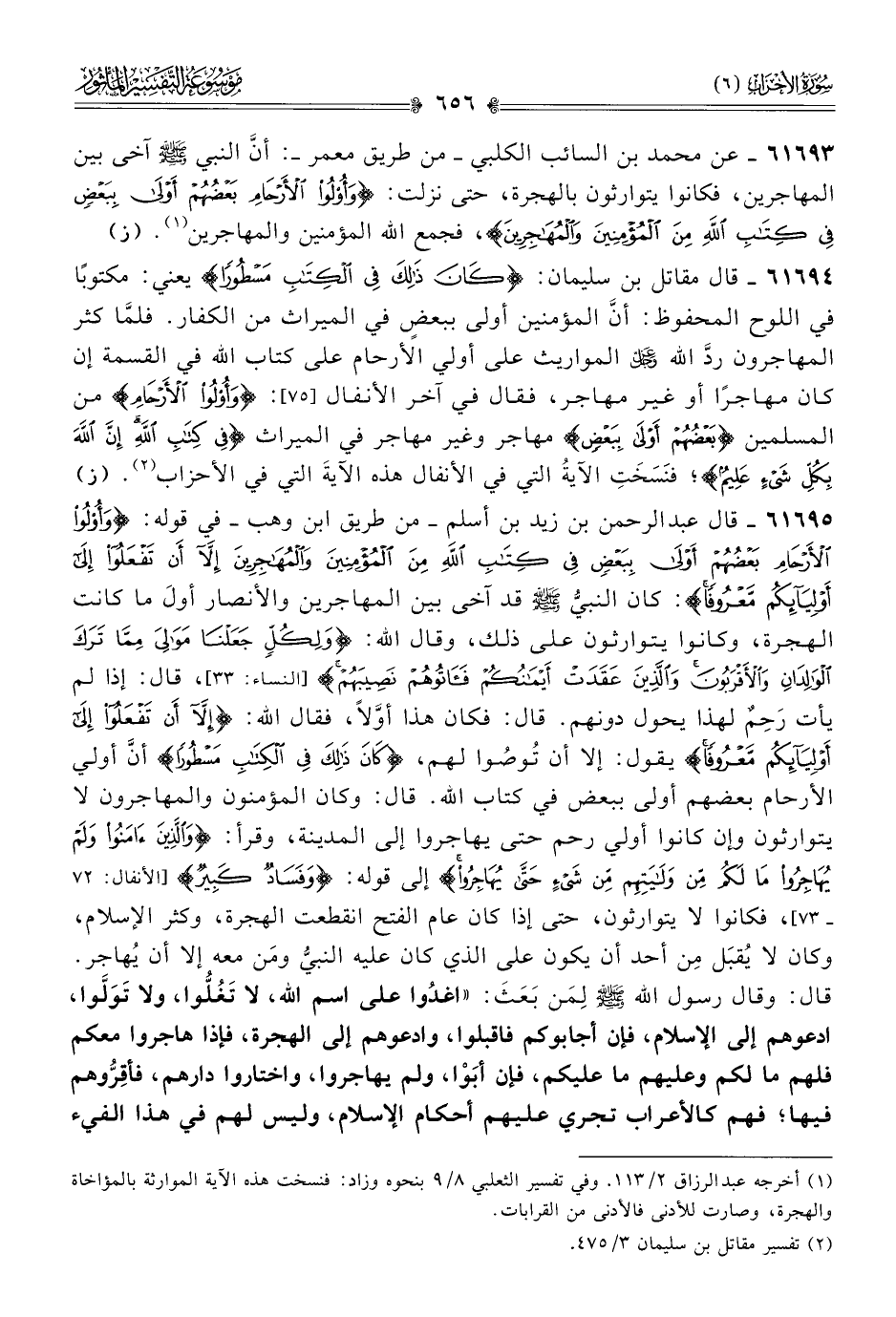 ٦١٦٩٥ - قال عبد الرحمن بن زيد بن أسلم -من طريق ابن وهب- في قوله: {وأُولُو الأَرْحامِ بَعْضُهُمْ أوْلى بِبَعْضٍ فِي كِتابِ اللَّهِ مِنَ المُؤْمِنِينَ والمُهاجِرِينَ إلّا أنْ تَفْعَلُوا إلى أوْلِيائِكُمْ مَعْرُوفًا}: كان النبيُّ - صلى الله عليه وسلم - قد آخى بين المهاجرين والأنصار أولَ ما كانت الهجرة، وكانوا يتوارثون على ذلك، وقال الله: {ولِكُلٍّ جَعَلْنا مَوالِيَ مِمّا تَرَكَ الوالِدانِ والأَقْرَبُونَ والَّذِينَ عَقَدَتْ أيْمانُكُمْ فَآتُوهُمْ نَصِيبَهُمْ} [النساء: ٣٣]، قال: إذا لم يأت رَحِمٌ لهذا يحول دونهم. قال: فكان هذا أوَّلًا، فقال الله: {إلّا أنْ تَفْعَلُوا إلى أوْلِيائِكُمْ مَعْرُوفًا} يقول: إلا أن تُوصُوا لهم، {كانَ ذَلِكَ فِي الكِتابِ مَسْطُورًا} أنّ أولي الأرحام بعضهم أولى ببعض في كتاب الله. قال: وكان المؤمنون والمهاجرون لا يتوارثون وإن كانوا أولي رحم حتى يهاجروا إلى المدينة، وقرأ: {والَّذِينَ آمَنُوا ولَمْ يُهاجِرُوا ما لَكُمْ مِن ولايَتِهِمْ مِن شَيْءٍ حَتّى يُهاجِرُوا} إلى قوله: {وفَسادٌ كَبِير} [الأنفال: ٧٢ - ٧٣]، فكانوا لا يتوارثون، حتى إذا كان عام الفتح انقطعت الهجرة، وكثر الإسلام، وكان لا يُقبَل مِن أحد أن يكون على الذي كان عليه النبيُّ ومَن معه إلا أن يُهاجر. قال: وقال رسول الله - صلى الله عليه وسلم - لِمَن بَعَثَ: «اغدُوا على اسم الله، لا تَغُلُّوا، ولا تَوَلُّوا، ادعوهم إلى الإسلام، فإن أجابوكم فاقبلوا، وادعوهم إلى الهجرة، فإذا هاجروا معكم فلهم ما لكم وعليهم ما عليكم، فإن أبَوْا، ولم يهاجروا، واختاروا دارهم، فأقِرُّوهم فيها؛ فهم كالأعراب تجري عليهم أحكام الإسلام، وليس لهم في هذا الفيء