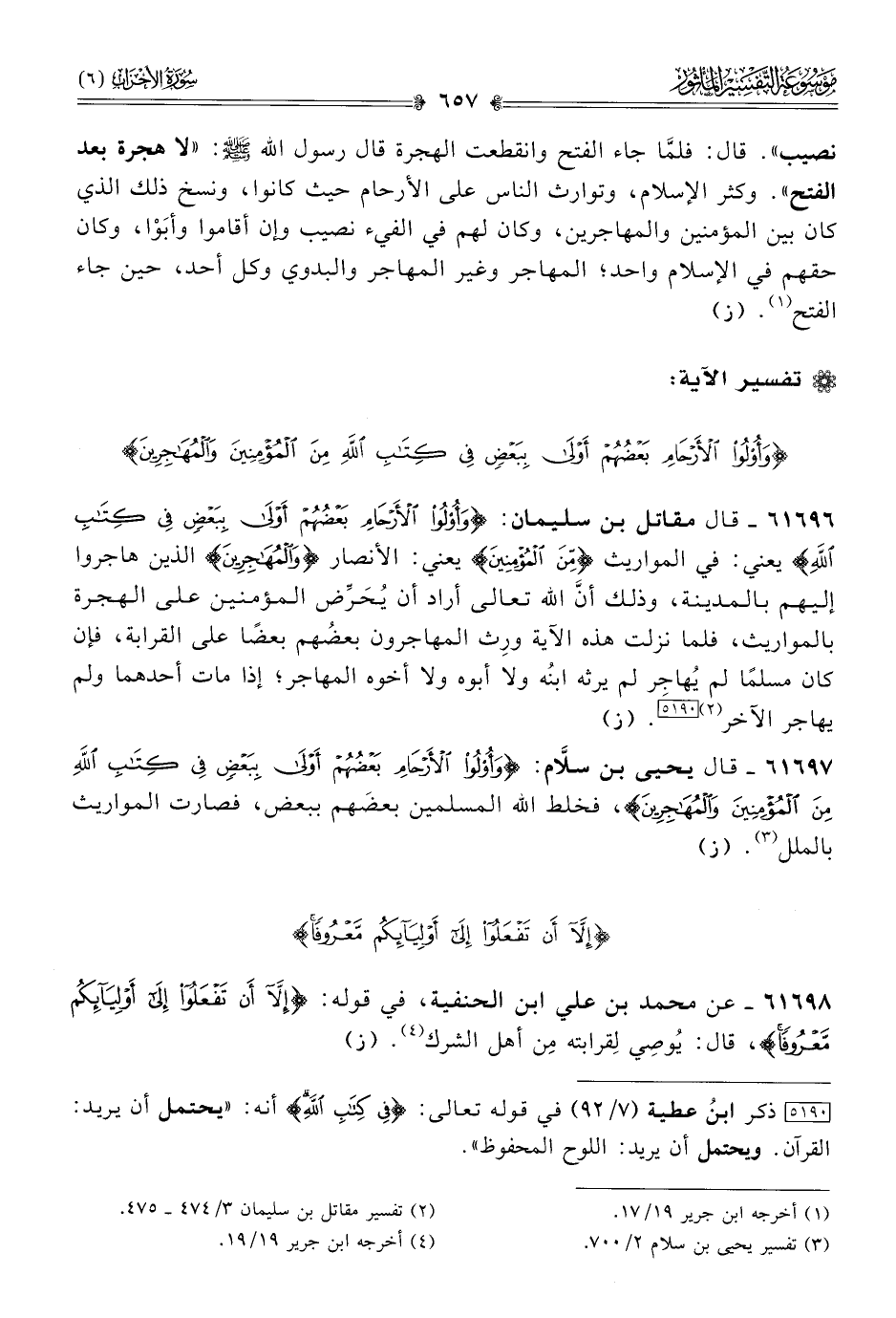 ٦١٦٩٧ - قال يحيى بن سلّام: {وأُولُو الأَرْحامِ بَعْضُهُمْ أوْلى بِبَعْضٍ فِي كِتابِ اللَّهِ مِنَ المُؤْمِنِينَ والمُهاجِرِينَ}، فخلط الله المسلمين بعضَهم ببعض، فصارت المواريث بالملل (¬٣). (ز)