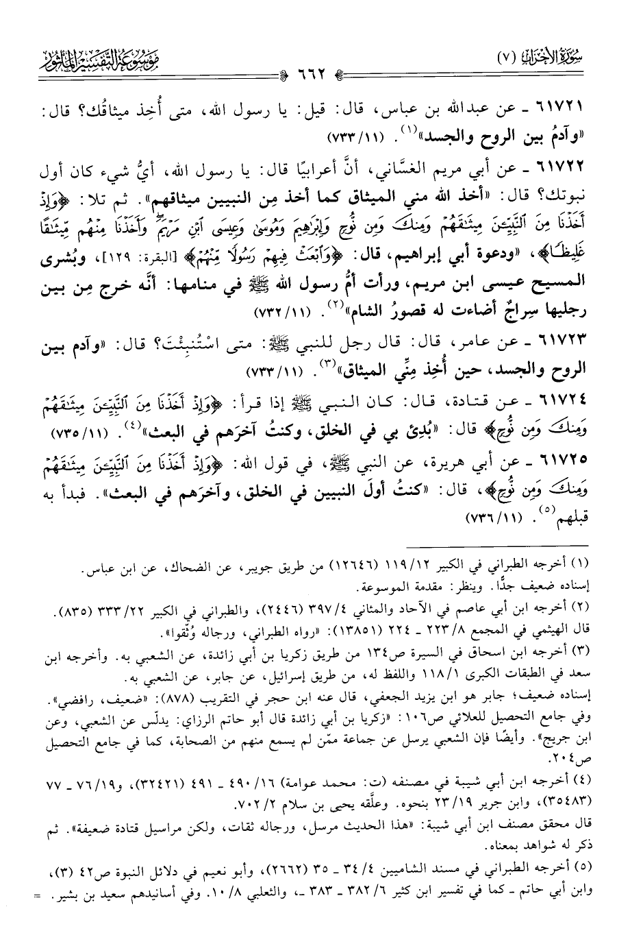 ٦١٧٢٥ - عن أبي هريرة، عن النبي - صلى الله عليه وسلم -، في قول الله: {وإذْ أخَذْنا مِنَ النَّبِيِّينَ مِيثاقَهُمْ ومِنكَ ومِن نُوحٍ}، قال: «كنتُ أولَ النبيين في الخلق، وآخرَهم في البعث». فبدأ به قبلهم (¬٥). (١١/ ٧٣٦)