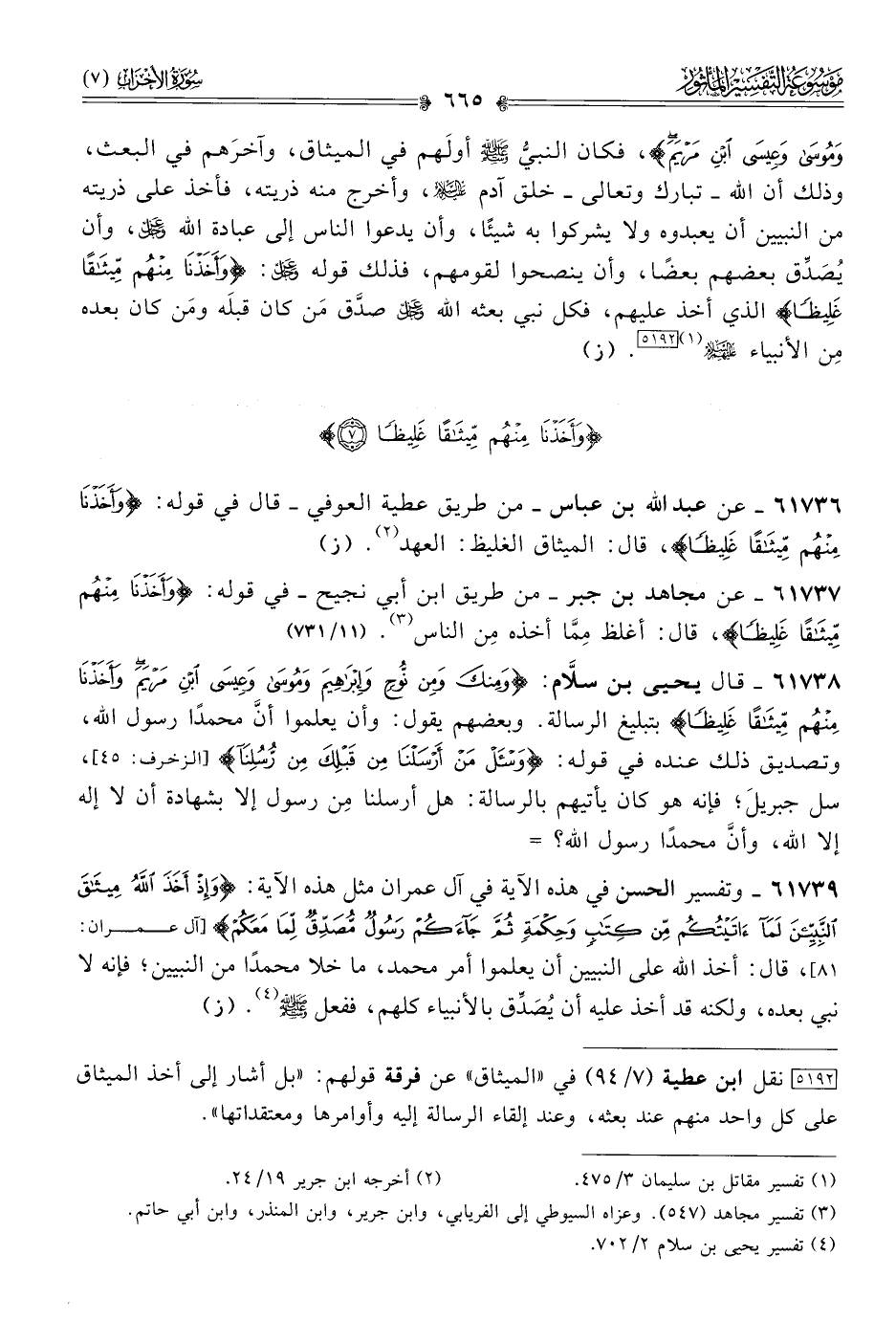 ٦١٧٣٨ - قال يحيى بن سلّام: {ومِنكَ ومِن نُوحٍ وإبْراهِيمَ ومُوسى وعِيسى ابْنِ مَرْيَمَ وأَخَذْنا مِنهُمْ مِيثاقًا غَلِيظًا} بتبليغ الرسالة. وبعضهم يقول: وأن يعلموا أنّ محمدًا رسول الله، وتصديق ذلك عنده في قوله: {واسأل من أرسلنا من قبلك من رسلنا} [الزخرف: ٤٥]، سل جبريلَ؛ فإنه هو كان يأتيهم بالرسالة: هل أرسلنا مِن رسول إلا بشهادة أن لا إله إلا الله، وأنّ محمدًا رسول الله؟ =