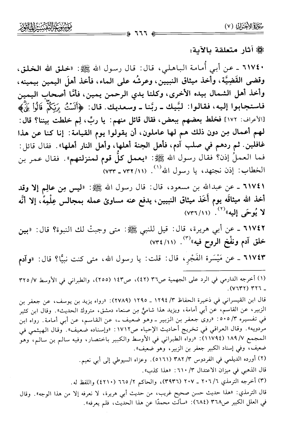 ٦١٧٤٠ - عن أبي أُمامة الباهلي، قال: قال رسول الله - صلى الله عليه وسلم -: «خلق الله الخلق، وقضى القَضِيَّة، وأخذ ميثاق النبيين، وعرشُه على الماء، فأخذ أهلَ اليمين بيمينه، وأخذ أهل الشمال بيده الأخرى، وكلتا يدي الرحمن يمين، فأمّا أصحاب اليمين فاستجابوا إليه، فقالوا: لبَّيك -ربَّنا- وسعديك. قال: {ألَسْتُ بِرَبِّكُمْ قالُوا بَلى} [الأعراف: ١٧٢] فخلط بعضهم ببعض، فقال قائل منهم: يا ربِّ، لِم خلطت بيننا؟ قال: لهم أعمال مِن دون ذلك هم لها عاملون، أن يقولوا يوم القيامة: إنا كنا عن هذا غافلين. ثم ردهم في صلب آدم، فأهل الجنة أهلها، وأهل النار أهلها». فقال قائل: فما العملُ إذن؟ فقال رسول الله - صلى الله عليه وسلم -: «يعمل كلُّ قوم لمنزلتهم». فقال عمر بن الخطاب: إذن نجتهد، يا رسول الله (¬١). (١١/ ٧٣٢ - ٧٣٣)
